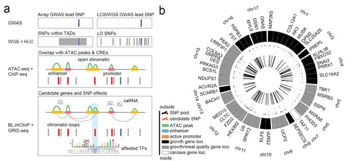 猪肉占我国居民肉类消费的60%,提高产肉效率是当前猪育种的主要目标。在过去的十多年中,全基因组关联研究(Genome-Wide Association Studies,GWAS)鉴定出了多个与猪产肉性状相关的QTL区域,但是如何进一步挖掘主效基因和因果变异,一直是一项重大挑战。一般来说,基因表达程序与顺式调控元件和染色质相关RNA(chromatin-associated RNA,caRNA)的相互作用密切相关。然而,由于缺乏染色质构象信息(或构象分辨率过低),以及缺少针对caRNA的研究手段,对这些遗传变异进行功能解释成为了猪功能基因组研究的瓶颈问题。