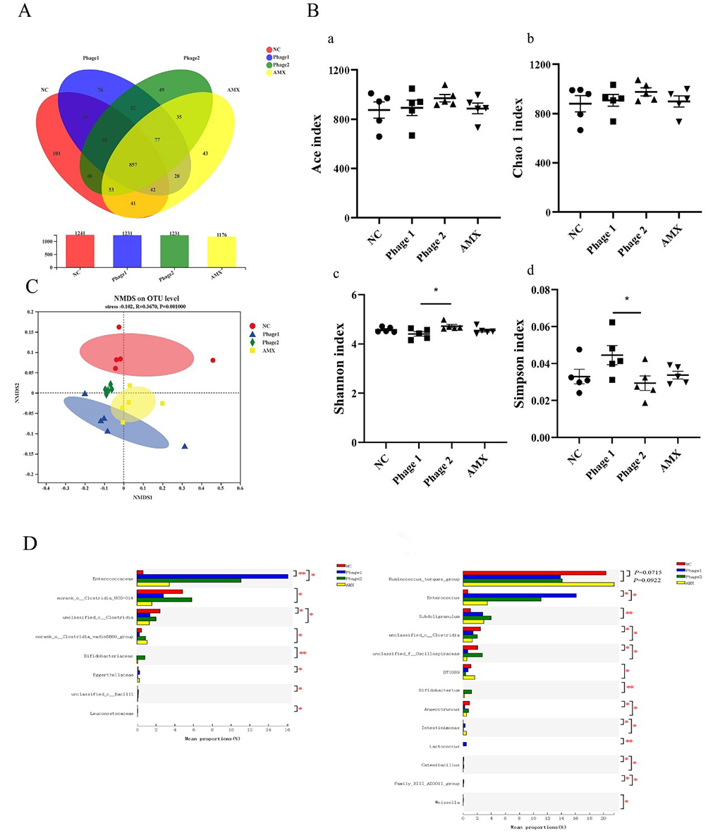 图1:噬菌体对盲肠菌群的影响以及差异菌群分析