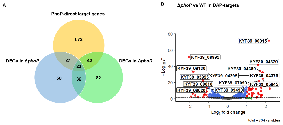 鸭传染性浆膜炎是由鸭疫里氏杆菌引起的急性、接触性、败血性传染病。该病以纤维素性心包炎、肝周炎、气囊炎和脑膜炎为特征,是目前危害养鸭业最严重的细菌性传染病之一。李自力教授团队多年来一直专注于鸭疫里氏杆菌的致病机制与免疫防控研究。课题组前期研究发现鸭疫里氏杆菌存在PhoPR双组份系统,这是在革兰阴性菌中首次报道的一种新双组份系统(Frontiers in Microbiology,2017)。本研究采用RNA-seq和DAP-seq技术进一步挖掘PhoPR在鸭疫里氏杆菌中的调控机制,筛选并验证了PhoP直接调控的基因,并且发现PhoP参与了氧气耐受的调节。本研究进一步对PhoP的DNA结合序列以及DNA结合能力进行了分析,动物试验结果表明phoP和phoR的缺失均能导致鸭疫里氏杆菌对雏鸭的致病力显著降低。为新药靶标的发现和基因缺失活疫苗的研发提供了理论依据和实验数据,同时为阐明鸭疫里氏杆菌的分子致病机制提供了新见解。