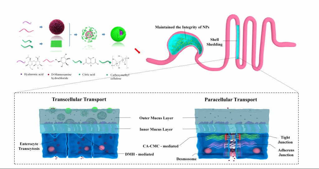 针对畜禽集约化养殖的发展,内服成为兽医临床最方便、最经济和最安全的给药方式。然而,兽用多肽抗生素在内服应用时面临胃酸降解、粘液清除以及肠上皮屏障等科学难题,导致至今鲜有多肽抗生素的内服制剂用于畜禽全身性感染疾病的治疗。我院兽药创制团队以多黏菌素为模型药物,巧妙利用自组装纳米凝胶技术设计了核壳纳米传递系统。该纳米传递系统能使其以完整的纳米粒到达肠道,避免其荷载的多肽抗生素在胃的提前释放和破坏降解。一旦到达肠道,外壳逐渐脱落释放内核纳米粒。内核纳米粒表面带有大量的亲水基团能使其快速穿过黏液层到达肠黏膜,然后借助纳米粒表面的甘露糖胺靶向肠道上皮细胞的葡萄糖转运体(GLT)实现其高效跨肠细胞转运。同时,利用脱落的外壳可逆性打开肠道上皮细胞间的紧密连接,增强细胞旁路转运。综合利用跨细胞转运和细胞旁路转运途径提高多肽抗生素的高效内服吸收,提高畜禽疾病的治疗效果。