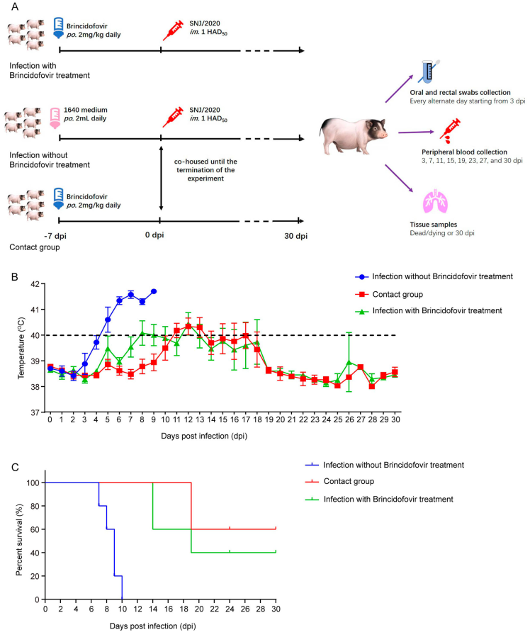 针对当前缺乏有效的抗ASFV药物的现状,陈焕春院士、王湘如教授团队基于原代猪肺泡巨噬细胞建立了一种抗ASFV化合物筛选模型,利用该模型对含有298种化合物的激酶抑制剂库进行筛选,共筛选到6种对ASFV抑制率大于90%的候选化合物,其中Brincidofovir(布罗福韦酯)对ASFV表现出最佳的抑制效果。通过体外实验发现,Brincidofovir能够剂量依赖性的抑制ASFV的复制(IC50= 2.76 nM),无细胞毒性(CC50= 58 μM),且Brincidofovir可以显著降低ASFV的病毒滴度,抑制病毒结构蛋白的表达。通过药物添加试验结果显示,Brincidofovir作用于病毒进入后阶段。体内实验数据表明,Brincidofovir能够有效抑制ASFV在猪体内的复制和水平传播。感染ASFV的仔猪在口服Brincidofovir后,存活率显著提高,感染导致的高热、病毒血症、排毒及组织病理损伤显著降低。该研究首次发现并验证了Brincidofovir对ASFV在体外和体内的抑制活性,为预防和控制非洲猪瘟药物的开发提供了新的思路和策略。