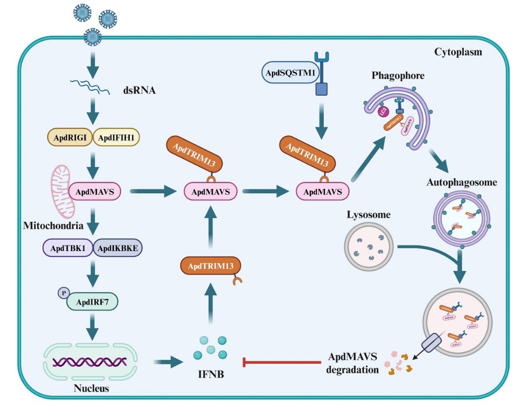 研究发现,鸭坦布苏病毒(DTMUV)等RNA病毒感染后,会显著上调鸭宿主蛋白TRIM13的表达。进一步研究表明,鸭TRIM13与鸭MAVS相互作用,促进了鸭MAVS与选择性自噬受体SQSTM1结合,从而介导鸭MAVS的选择性自噬降解,帮助病毒逃逸宿主的天然免疫反应。此外,该研究发现,鸭MAVS的自噬降解并不依赖于鸭TRIM13的E3连接酶活性或鸭MAVS的泛素化修饰。