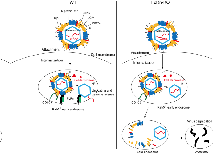 该研究发现FcRn是PRRSV感染细胞的必需宿主因子,参与病毒的脱衣壳,为阐明PRRSV的早期感染过程奠定了基础,为抗PRRSV的药物研发和分子抗病育种提供了潜在靶标。