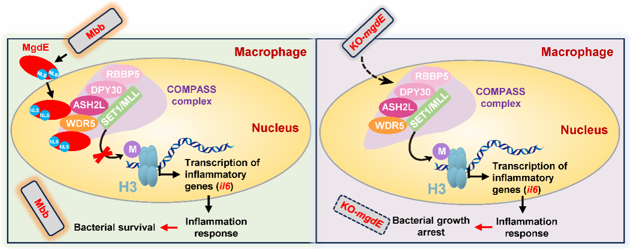 论文1:发现结核杆菌核调蛋白MgdE 劫持宿主表观遗传复合物 COMPASS,抑制炎症基因表达,促进病原胞内存活