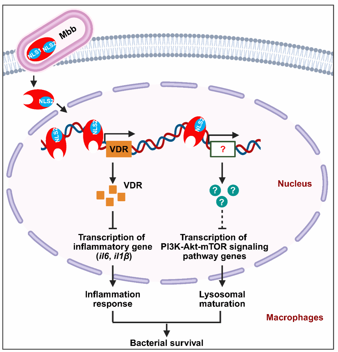 研究团队对结核分枝杆菌中一个高度保守的假想蛋白 Rv2577 进行了系统的功能解析,并将其命名为 MmpE。研究结果表明,MmpE 不仅是一种典型的 Fe³⁺/Zn²⁺ 依赖性金属磷酸酯酶,具有磷酸酶活性,还具有显著的核调节功能。MmpE含两个核定位信号序列(RRR20–22和 RRK460–462),能主动转运至宿主细胞核。在核内,MmpE能够特异性结合宿主维生素D受体(VDR)基因的启动子区域,抑制VDR的转录表达,进而抑制 VDR 介导的抗菌基因转录程序,削弱宿主的先天免疫防御。此外,MmpE 还通过抑制 PI3K–Akt–mTOR 信号通路的激活,阻断吞噬体的成熟过程,从而干扰病原体的溶酶体依赖性清除机制。在干预宿主转录调控与细胞自主免疫过程的双重作用下,MmpE 显著提升了结核分枝杆菌在宿主细胞内的生存能力。细胞及小鼠感染模型实验进一步表明,MmpE 缺失菌株在宿主中的存活能力明显下降,且诱导更强烈的宿主免疫应答。上述结果充分说明,MmpE 在调控宿主免疫、促进结核分枝杆菌免疫逃逸及慢性感染形成过程中发挥着关键作用。