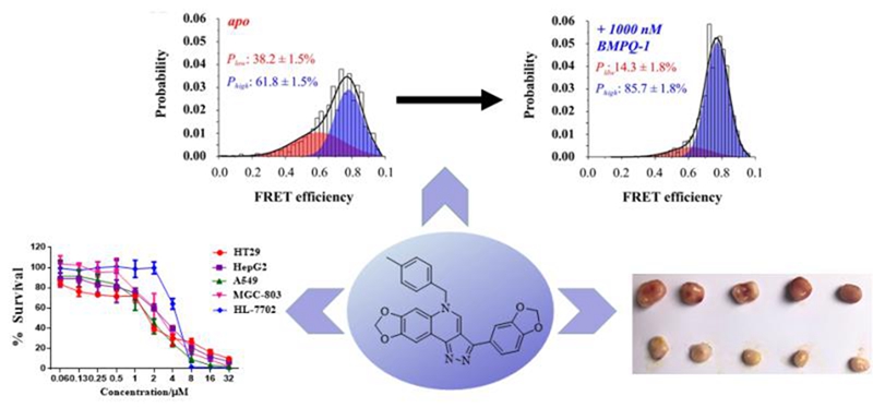 团队采用荧光共振能量转移(FRET)分析、圆二色谱(CD)熔融以及荧光光谱扫描等方法,鉴定出特异性识别二聚G-四链体TTA45的化合物BMPQ-1。BMPQ-1可有效抑制小鼠体内肿瘤的生长,不影响小鼠体重。免疫荧光分析表明,BMPQ-1可诱导端粒末端G-四链体的形成并引起端粒DNA损伤反应。单分子荧光共振能量转移(smFRET)和CD光谱研究表明,BMPQ-1通过改变TTA45在溶液中的构象系综,进而实现对其选择性识别。该工作为靶向G-四链体的抗肿瘤药物研究奠定了基础。