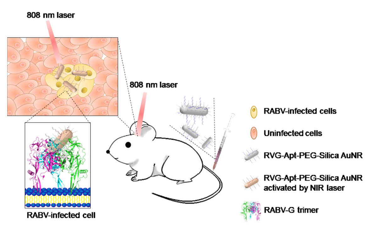 在该研究中,赵凌教授团队首先筛选了一个能够特异性结合狂犬病毒表面糖蛋白的适配体,并将该适配体结合在一个外形和大小接近狂犬病毒的纳米金棒表面。该金纳米棒在静脉注射后能够有效穿越小鼠血脑屏障入脑,并且靶向性结合于狂犬病毒感染的神经细胞。利用近红外光照射感染小鼠的脑部后,可以在纳米金棒表面产生局部高温,“烧死”感染病毒的细胞,最终清除脑内的病毒,该方法称之为“光热疗法”。