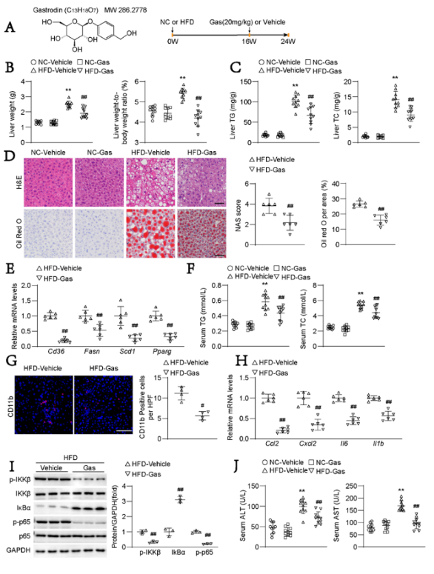 Approach and result:In our study, Gastrodin showed potent therapeutic effects on NASH both in vivo and in vitro. In high-fat diet (HFD)- or high-fat and high-cholesterol (HFHC) diet-fed mice, the liver weight, hepatic and serum triglyceride and cholesterol contents, the serum alanine aminotransferase (ALT) and aspartate aminotransferase (AST) activity levels were markedly reduced by Gastrodin treatment as compared to the corresponding vehicle groups. Notably, Gastrodin showed minimal effects on the function and histological characteristics of other major organs in mice. We further examined the effects of Gastrodin on lipid accumulation in primary mouse hepatocytes and human hepatocyte cell line, and observed that Gastrodin showed a significant decrease in lipid accumulation and inflammatory response in hepatocytes under metabolic stress. Furthermore, RNA-Seq analysis systemically indicated that Gastrodin suppressed the pathway and key regulators related to lipid accumulation, inflammation and fibrosis in the pathogenesis of NASH. Mechanistically, we found that Gastrodin protected against NASH by activating the AMPK pathway, which was supported by the result that the AMPK inhibitor compound C or AMPK knockdown blocked the Gastrodin-mediated hepatoprotective effect.