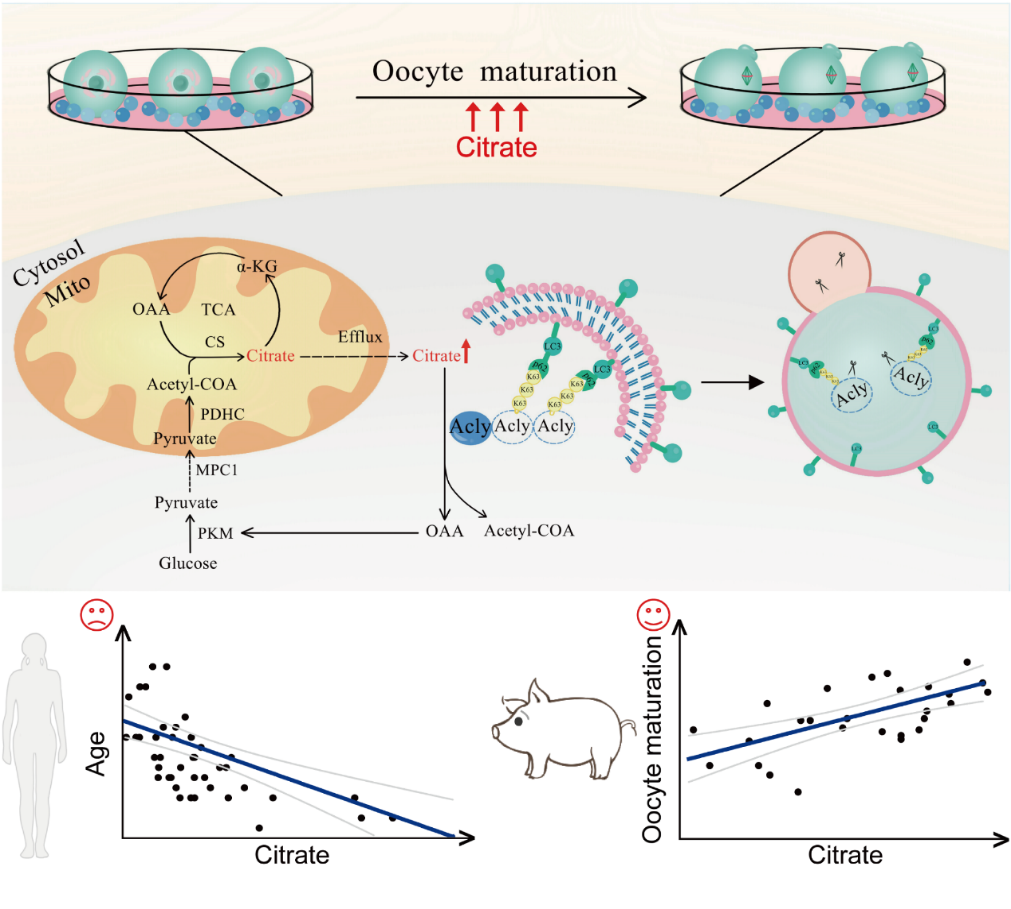 此外,通过对培养液的代谢组学分析,发现颗粒细胞自噬损伤对卵母细胞成熟质量的不利影响是由柠檬酸不足引发的,外源补充柠檬酸盐可显著恢复卵母细胞的成熟质量。为了找到柠檬酸调控的分子机制,该团队进行了蛋白免疫共沉淀实验,并将ACLY (ATP柠檬酸裂解酶)锁定为重要的候选分子。通过进一步探索证实SQSTM1/p62通过其泛素结合位点(UBA)与ACLY相互结合,促使ACLY的自噬性降解。通过对人类卵泡的进一步分析,研究人员发现伴随着母体衰老,颗粒细胞的自噬水平显著下调,卵泡液中柠檬酸盐浓度也显著降低。此外,猪卵泡液中的柠檬酸盐浓度也可正向指示卵母细胞的成熟质量(图2)。