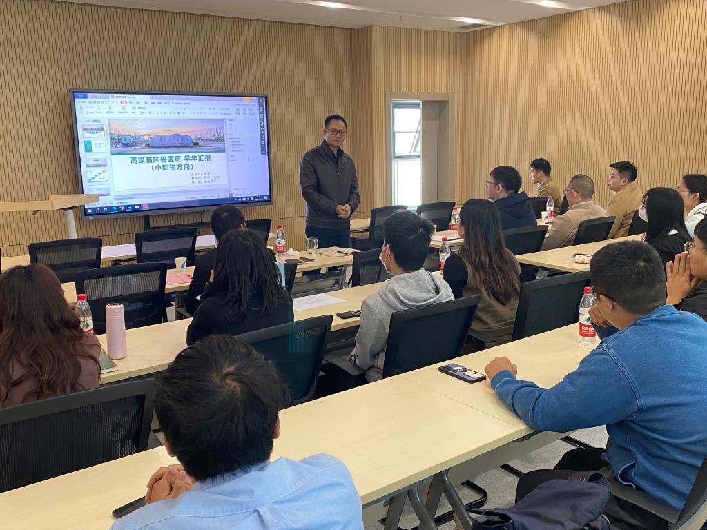 (通讯员:张悦 汪楚琪 许银行)10月12日上午,tyc122cc太阳成集团2021级专业学位硕士高级临床兽医人才培养改革创新班学年汇报在第四综合楼B座201会议室举行。学院党委书记刘兴斌老师,副院长彭贵青教授,高级临床兽医班班主任谭臣教授、丁一副教授,许明副教授及人才班全体同学参加汇报。汇报由研究生辅导员陈泊宁主持。