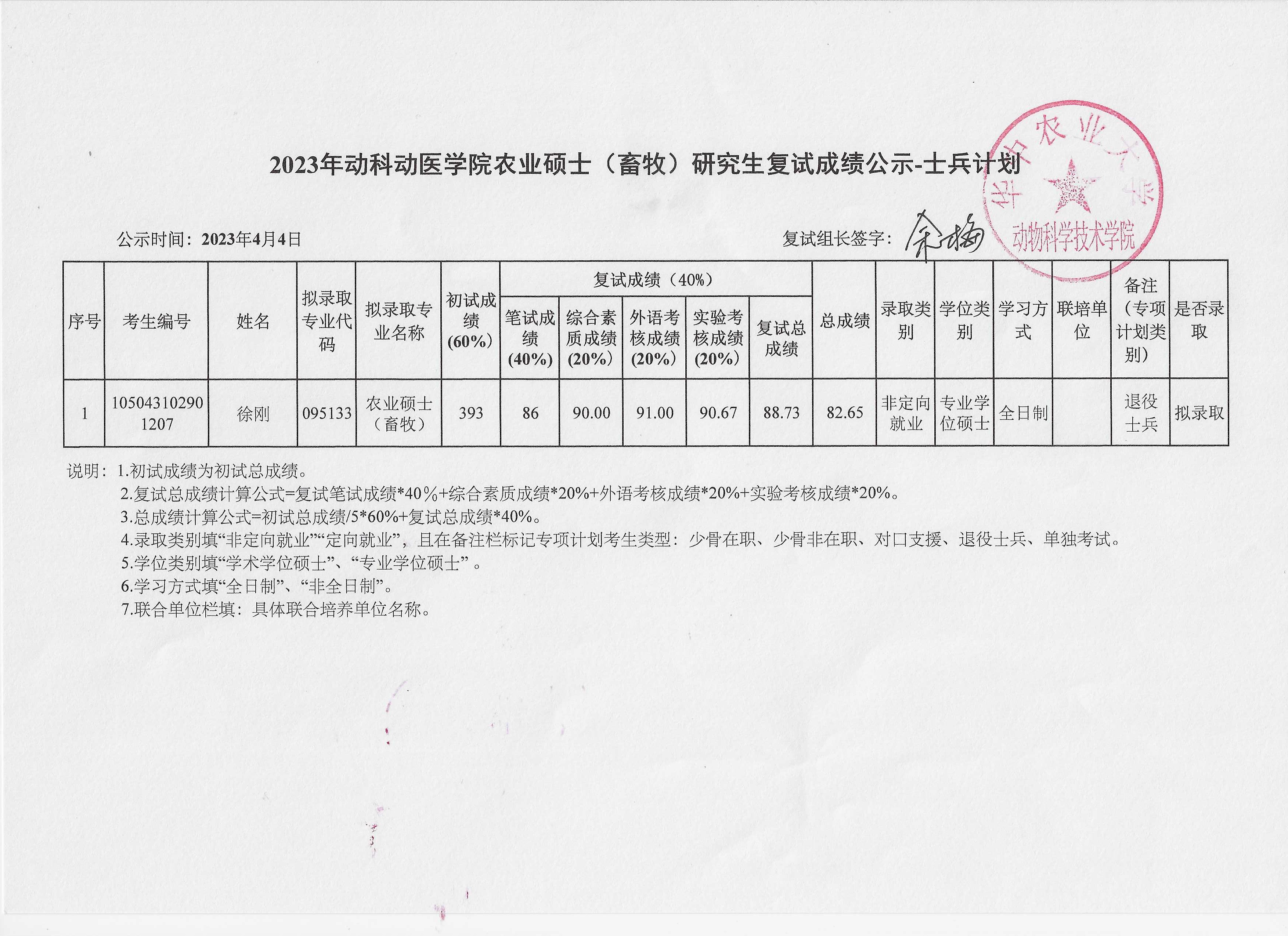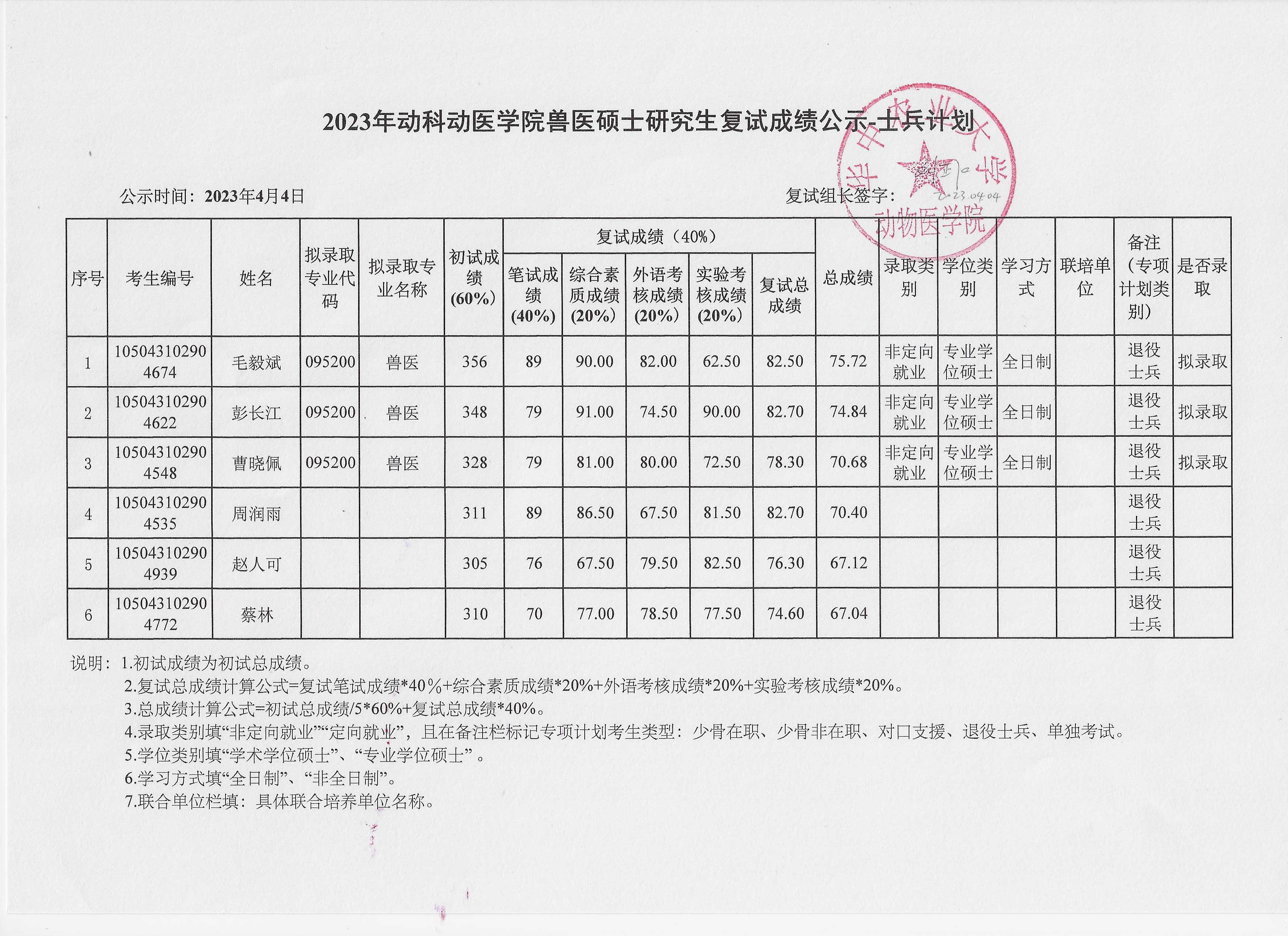 农业硕士(畜牧)复试成绩公示-士兵计划