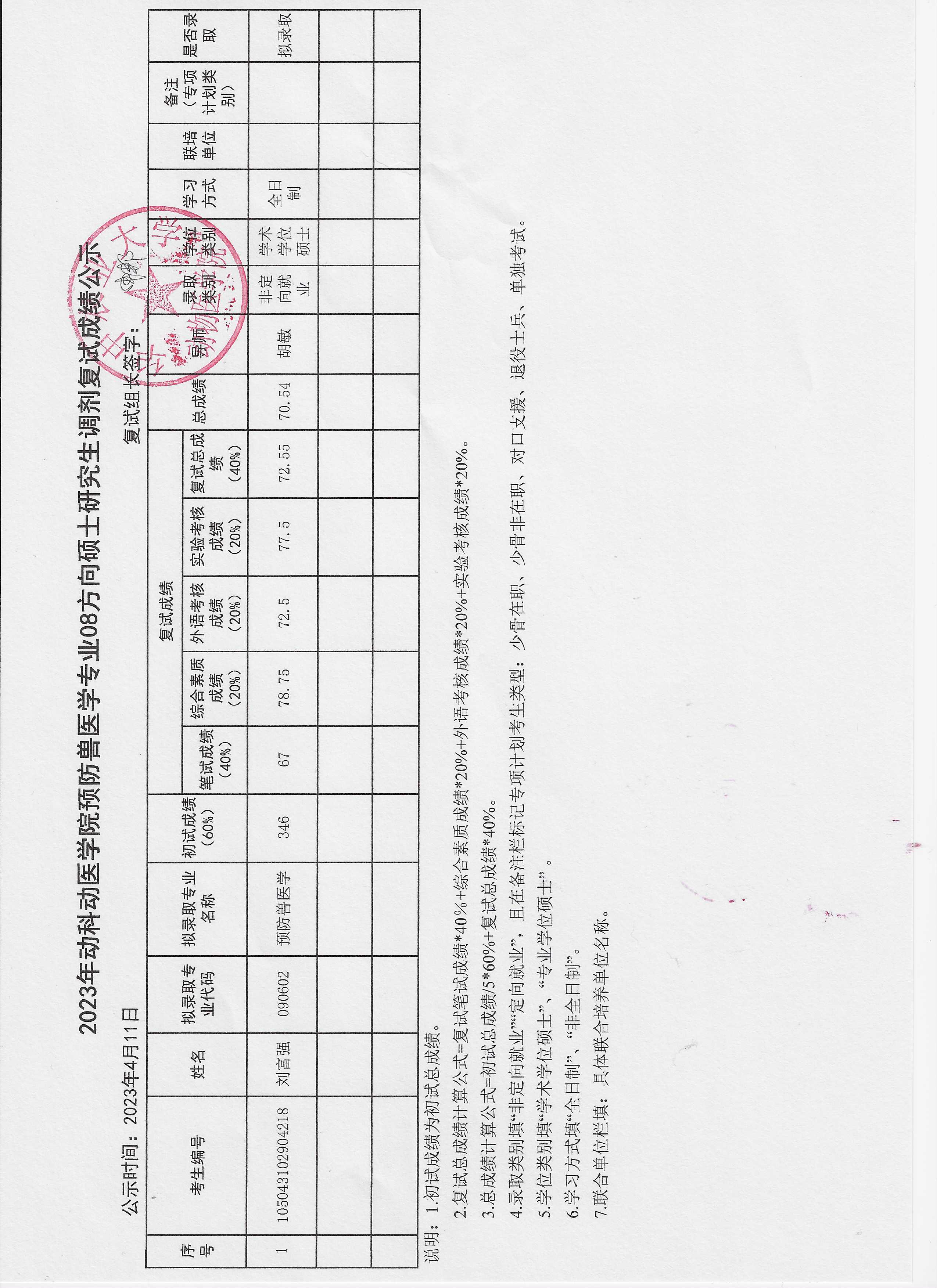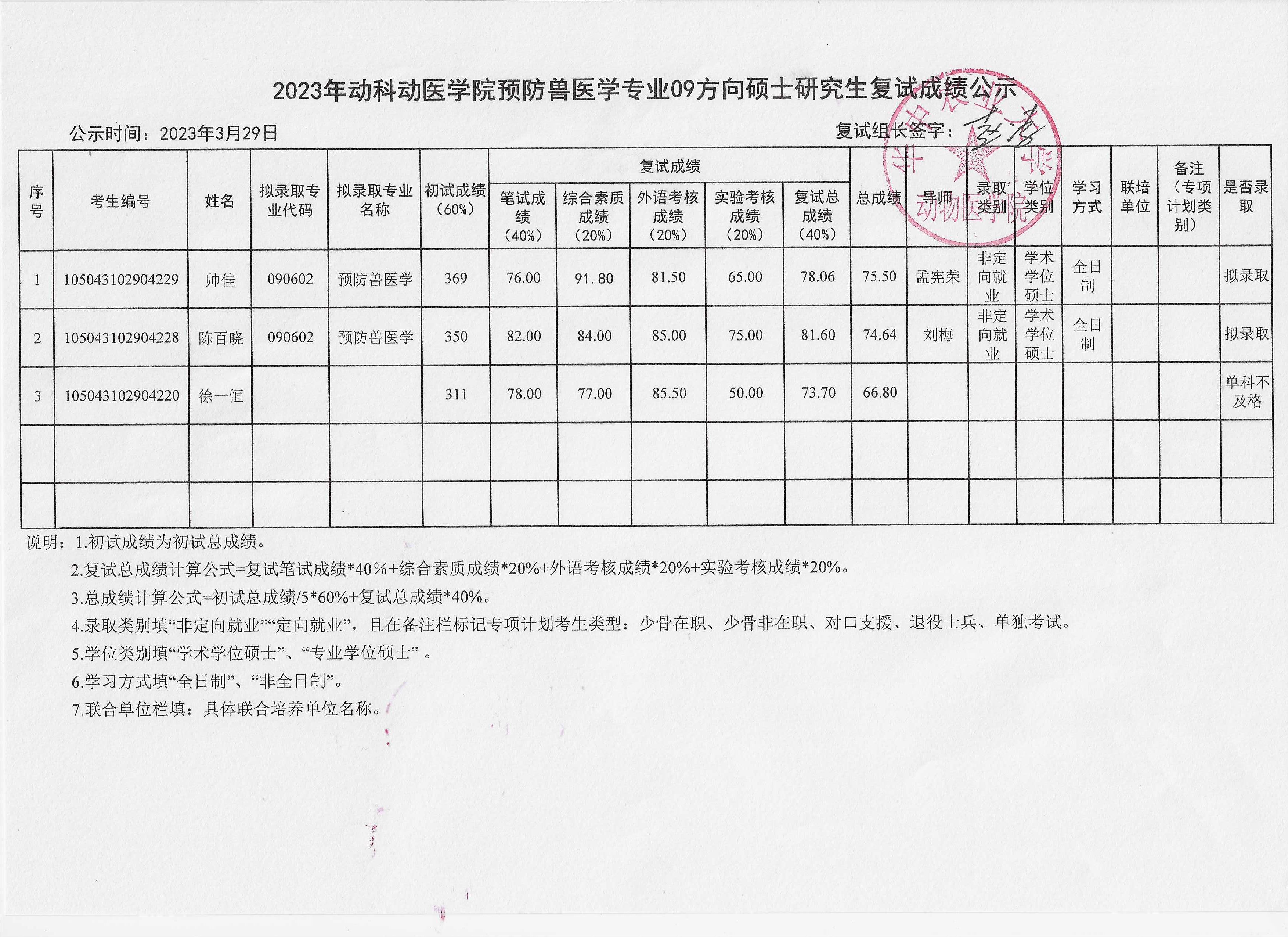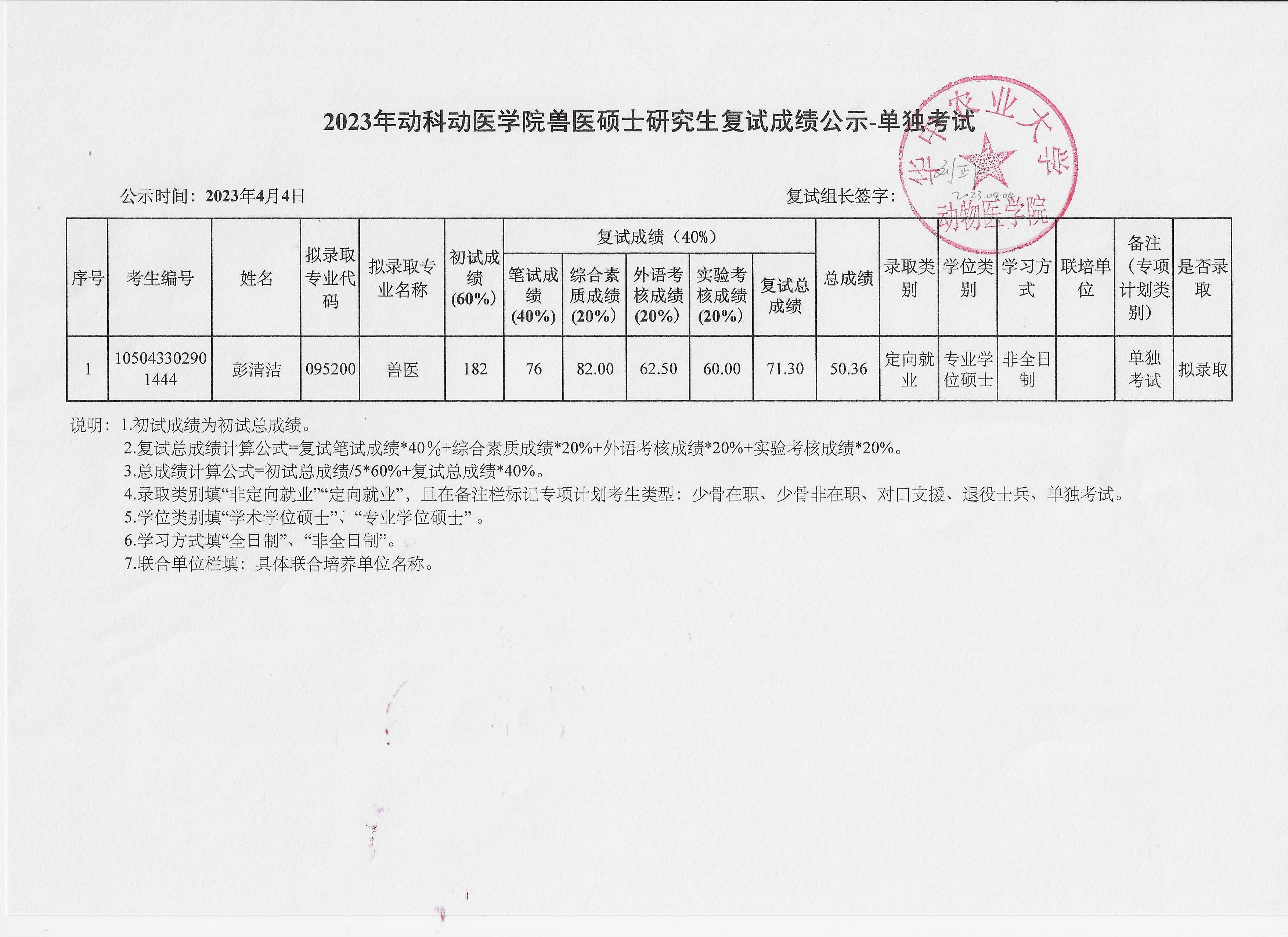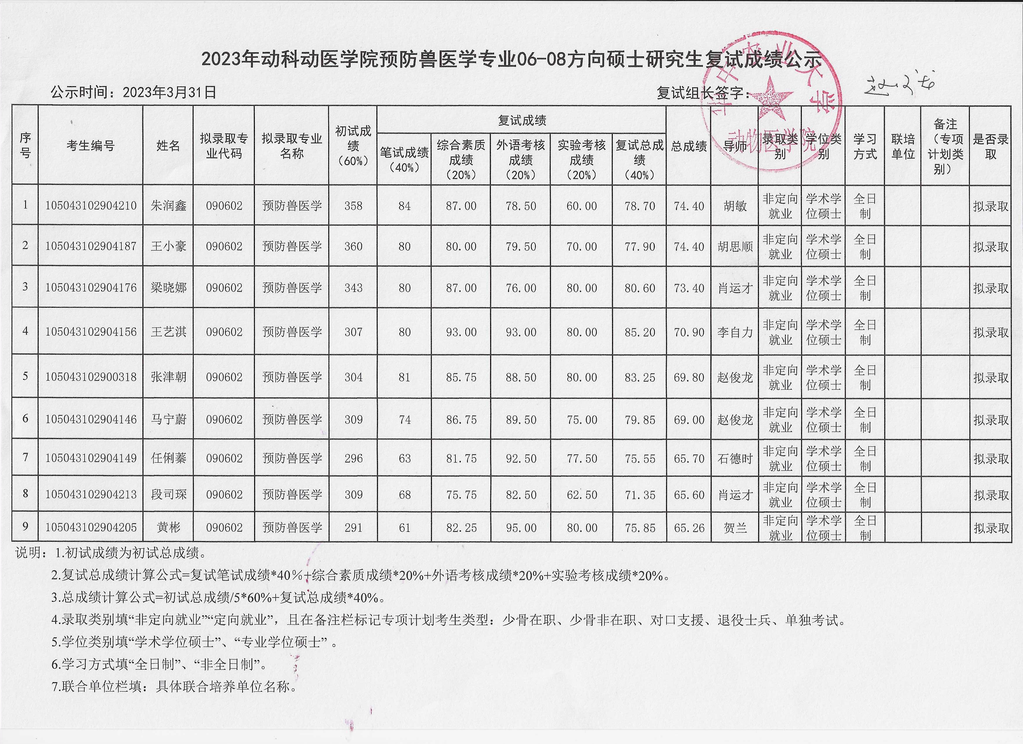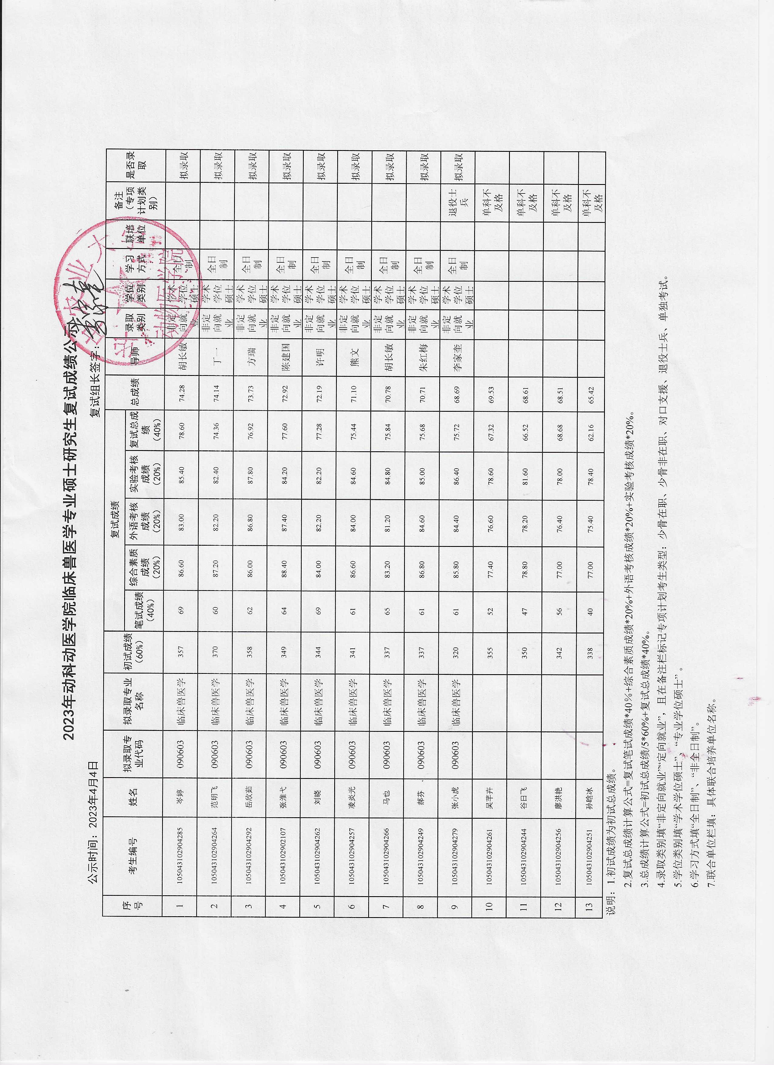 基础兽医学专业04-07方向复试成绩公示-普通学硕