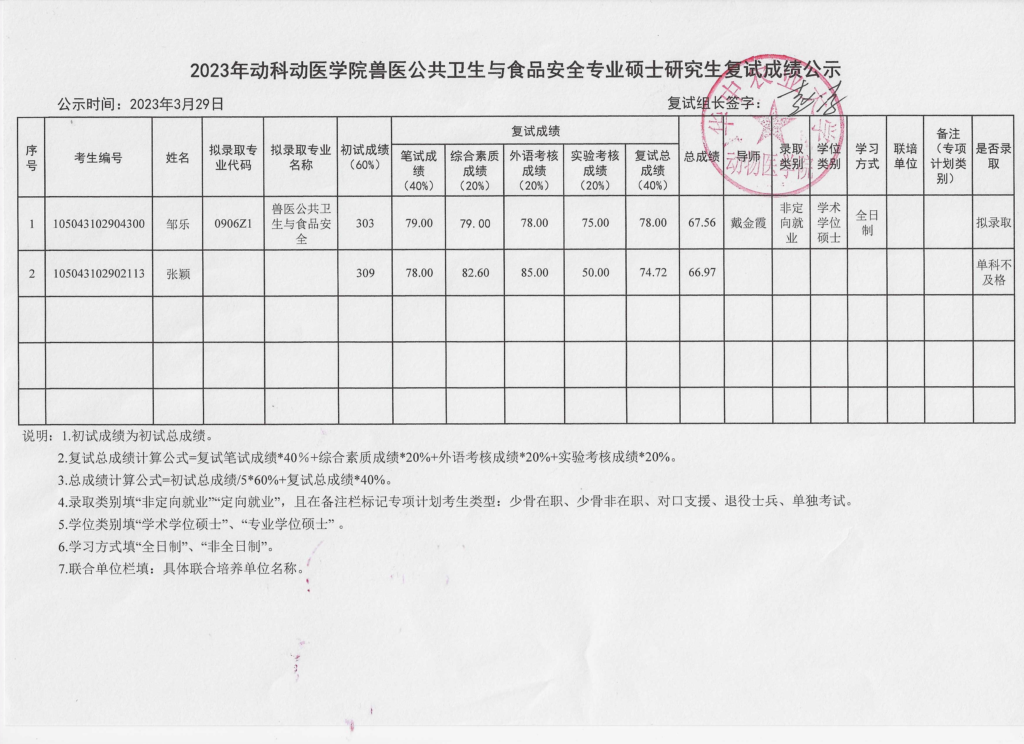 农业硕士(畜牧)复试成绩公示-普通专硕