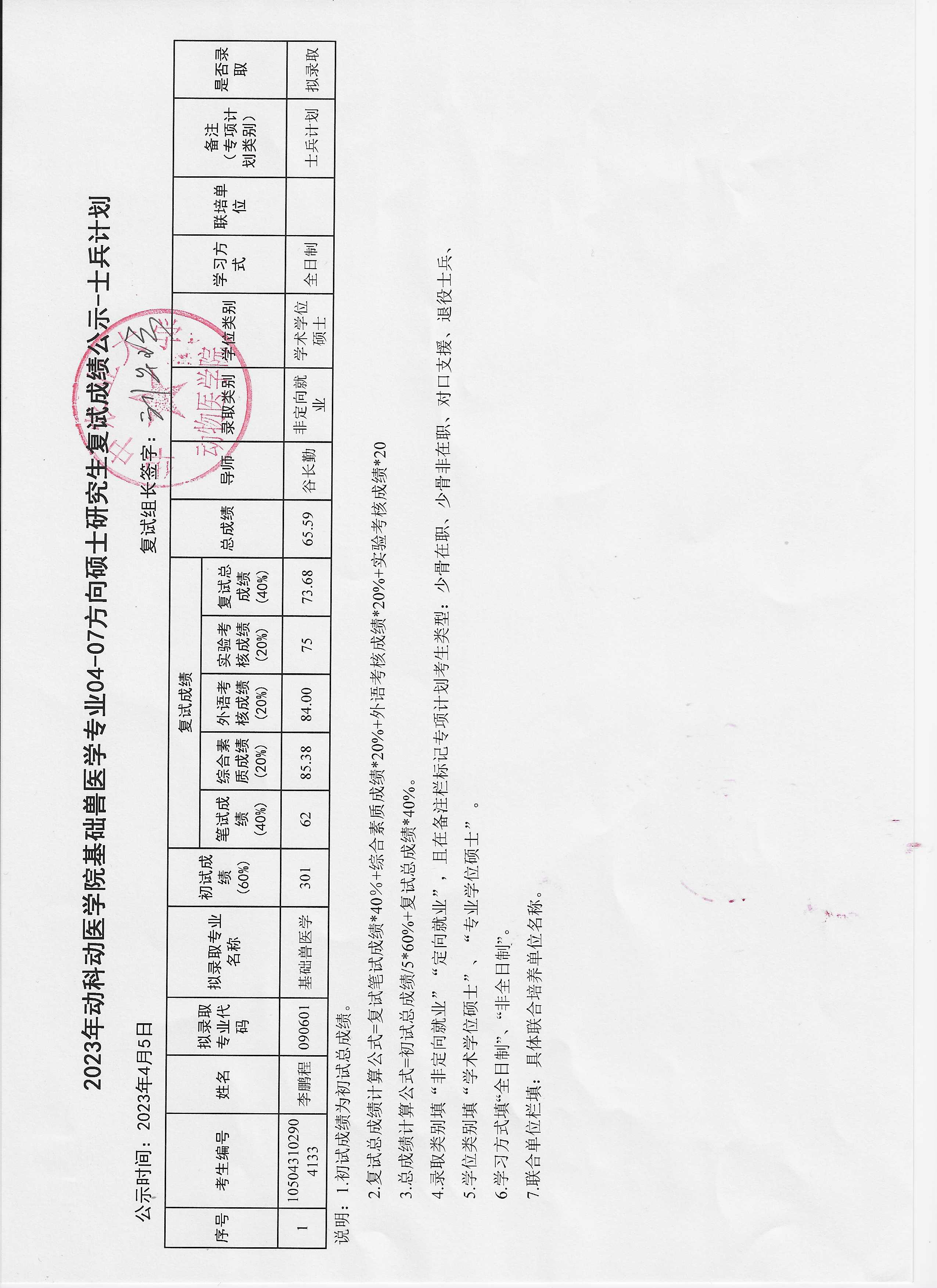 基础兽医学专业04-07方向复试成绩公示-士兵计划