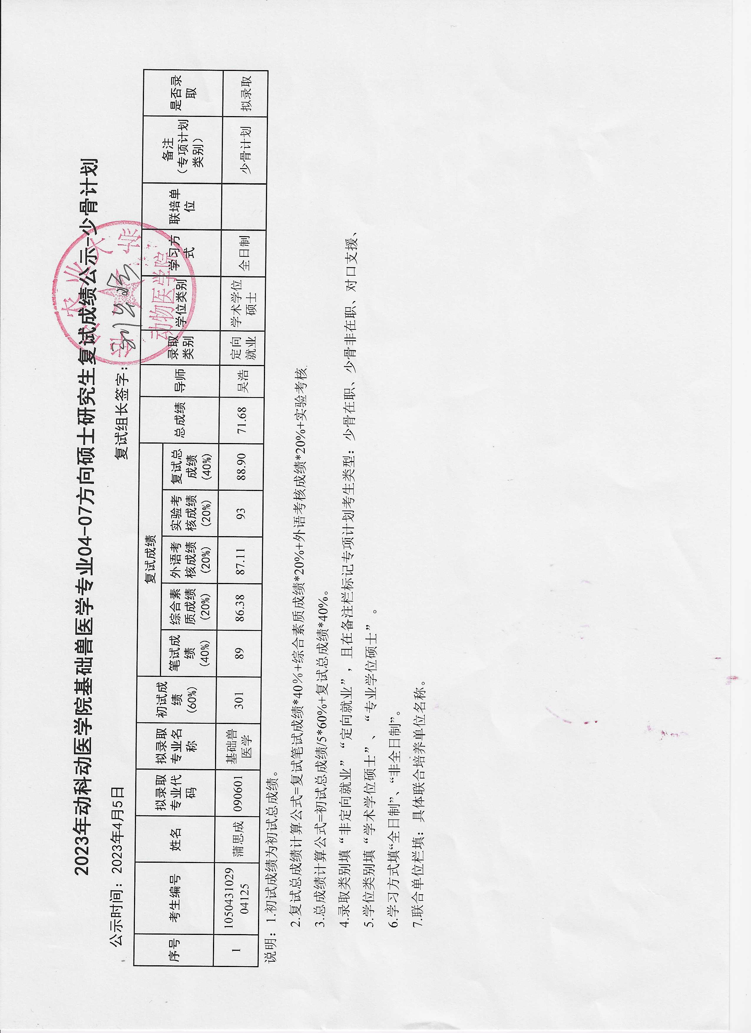 基础兽医学专业04-07方向复试成绩公示-少骨计划