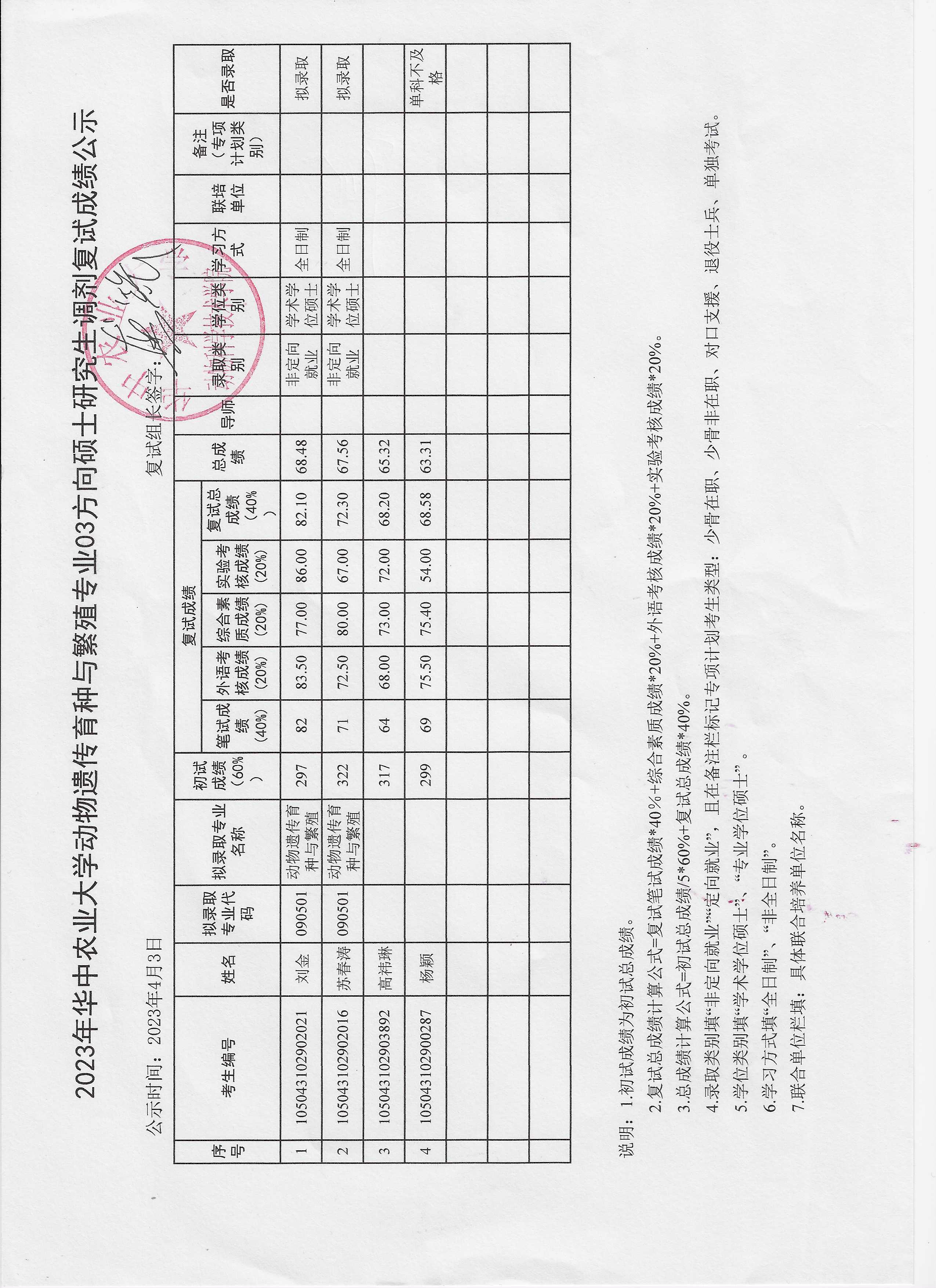 动物遗传育种与繁殖专业03方向复试成绩公示