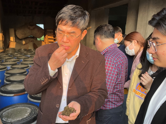会后,何董带领我院师生参观公司繁殖场和发酵饲料贮存间。通过监控视频和环绕繁殖场外围,何董就猪场结构布局、生物安全防范、饲养管理、无害化处理等方面的优秀举措与同学们展开交流,大家纷纷为公司卓越的生产成绩感到赞叹。在发酵饲料贮存间,何董介绍了公司独创的构树发酵饲料,该饲料有蛋白含量高、适口性好、耐储存、促生长效果佳等优点,是公司下一阶段发展的重点产品。