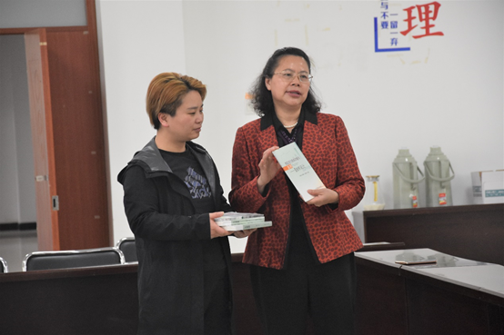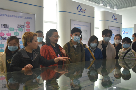 来到牛场后,曾经理首先带领我院师生参观公司展厅,介绍奶牛场的整体布局,接着带领同学们在观光通道参观牛棚、挤奶厅和生鲜乳化验室,并由奶厅主管车彦为学生们介绍奶牛场的生产工艺流程及挤奶厅60位转盘式挤奶台。随后奶牛场各部门生产主管与全体师生举行互动座谈会,会上同学们品尝了本场现挤鲜奶,并就奶牛场的生产流程、饲养管理、疾病防控、生物安全等方面向各位主管提出问题、进行交流。会后,郭爱珍教授向公司工作人员赠送由其主编的牛病专业书籍,全体师生与奶牛场工作人员进行合影留念。