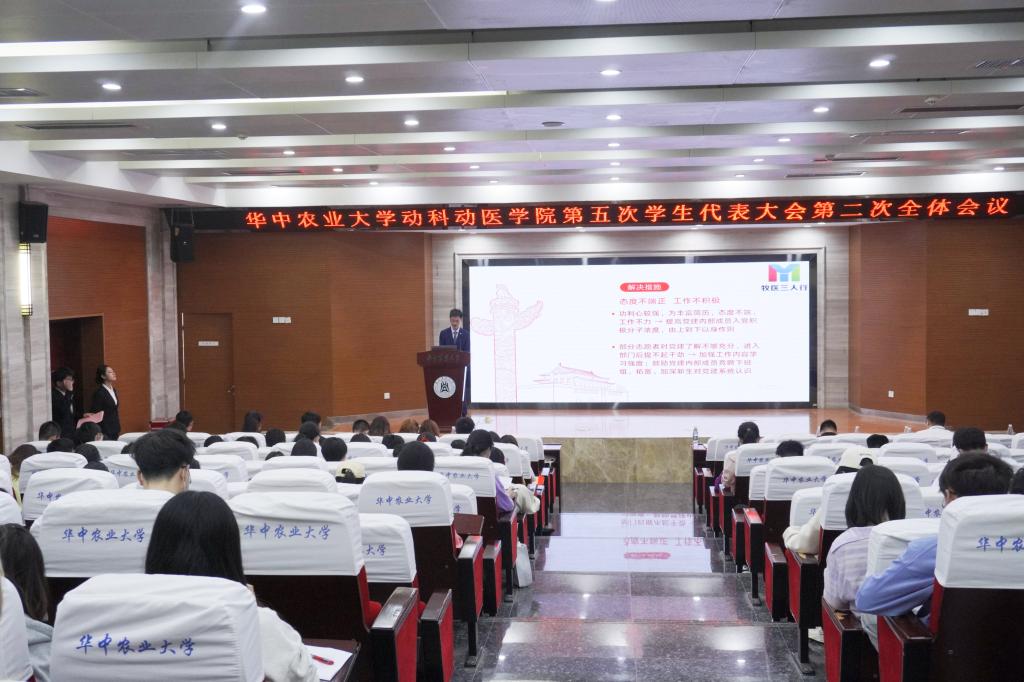 (通讯员:蒋琪琪 摄影:杨春)5月15日中午,动科动医学院第五次学生代表大会第二次全体会议于学生综合服务楼501报告厅举行。本科生辅导员王运涛、谭力铭、汪昱均、程唐煜,校学生会轮值主席李博涵以及100名由各班级民主推荐选举出的学生代表参会,会议由学院学生会轮值主席吕满主持。