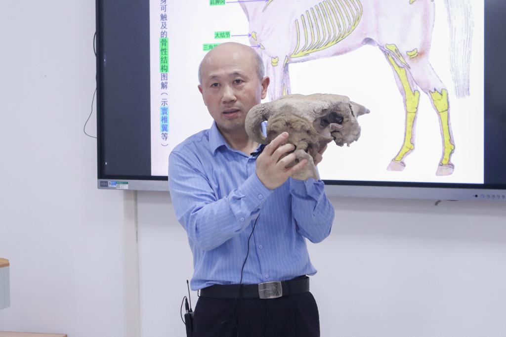 5月21日晚,动科动医学院基础兽医系教授邱德新在四综A103教室给参赛小组进行赛前培训。他结合自己多年从教经验,将理论知识与实物想联系,系统介绍了牛骨骼特点。在互动环节,他鼓励大家在比赛过程中要自信、多思考,以一颗平常心态参加比赛。