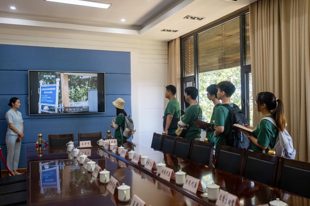 在习近平总书记召开座谈会的会议室中,社会实践队成员们看影视录像,听习近平总书记讲话,感受当时会议现场气氛。“习近平总书记就是在这里做出了‘小康不小康,关键看老乡’的重要指示”韦乡怡如是说。10年前,习近平总书记坐在村民代表中间,听取民意,了解民情,贯彻以人民为中心的发展思想,提出了全面建设小康社会难点在农村,工业化、信息化、城镇化要与农村现代化、新农村建设同步发展的重要论断,为峒山村进一步建设指明了方向。室内挂着一张张会议照片,韦乡怡向实践队员们介绍了它们背后的故事。