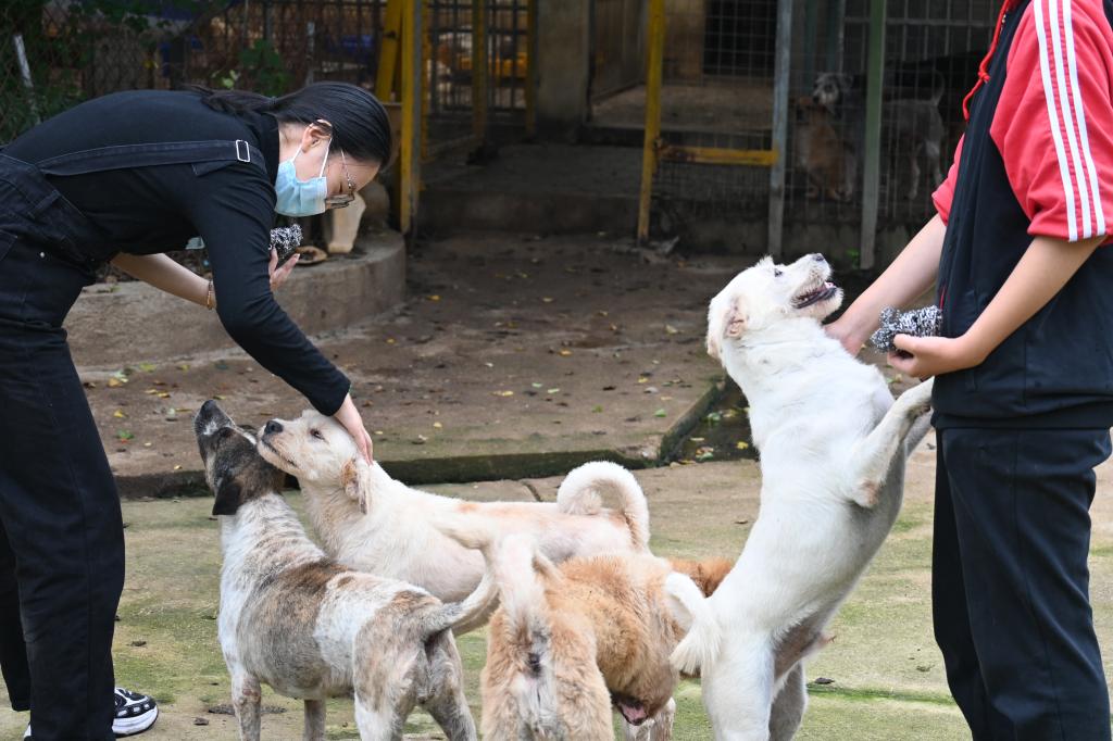 随后,在基地工作人员的带领下,志愿者们熟悉了狗舍分布以及流浪狗的性格和饲养状况,并通力合作、积极有效地完成了任务。“在饲喂过程当中,我们和流浪动物亲密接触,并切身体会到了基地工作人员工作的艰辛,也感受到了陪伴流浪动物生活、成长的幸福感”,额头上仍挂着汗水的动医2301班郑浩然满怀喜悦地说道。