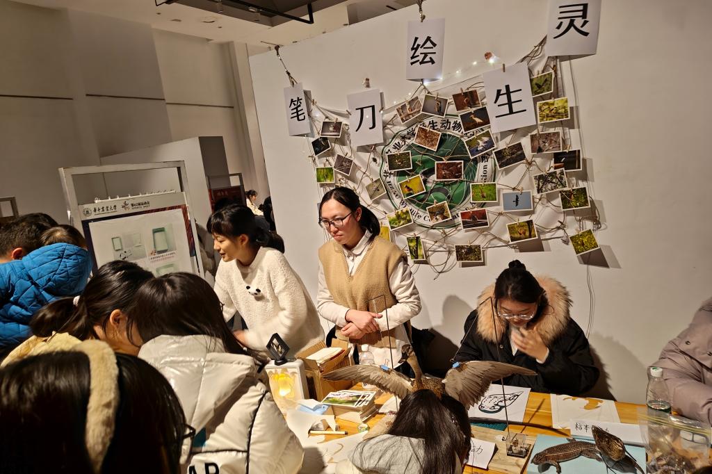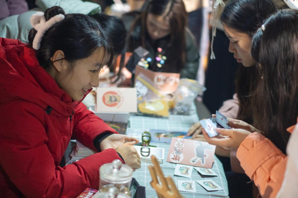 在“可持续艺术,绿色财富”摊位中,可以利用易拉罐等可回收物品进行diy,体验变废为宝的乐趣;在“凝固指尖的春色~缠花”摊位中,可以感受到非遗文化穿越时光的华美,每一丝、每一线,都充满了情感和温度;在“笔刀绘生灵,点灯迎新春”摊位中,可以体验到非遗纸雕艺术制作,层次分明、光影交错,通过点亮野生动物纸雕灯,点亮这些美丽生灵永久存续的明天;“新年绘青春”——文化衫DIY活动让师生展现出自己对华农与大学生活的认知与热爱,在跨年夜中,用不同色彩点亮心中的希望。
