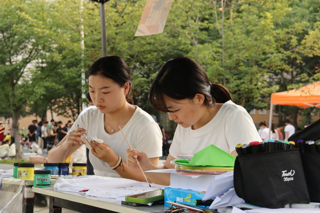在“文化衫创作”环节,文宣部工作人员与志愿者拿出准备好的颜料、水桶、画笔和T恤,从参与条件、制作方法与绘画过程中的注意事项三个方面进行讲解,并在一旁辅助活动参与同学进行创作。“参与的同学可以选择喜爱的画笔和颜料,在白T恤上尽情创作”,文宣部成员田雨霏说道。