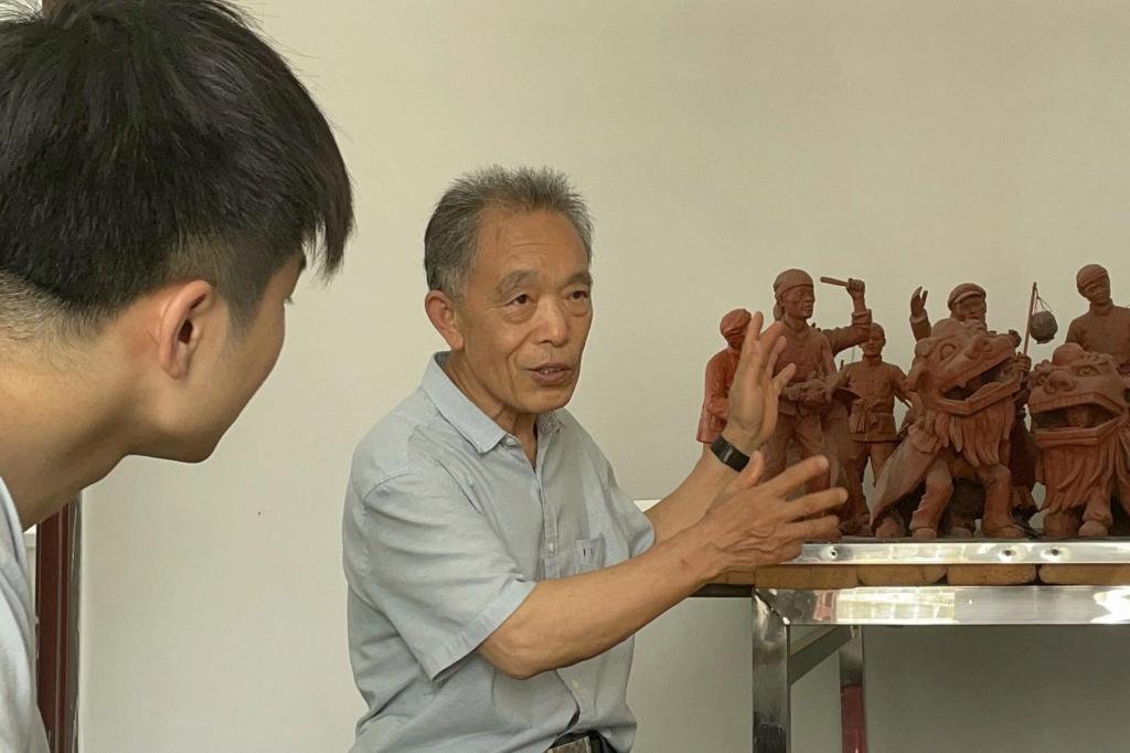 “黄陂泥塑的一大重要特点是,它的作品大多是不上色的,比如我做的这些动物泥塑,都是以泥土的本色呈现事物......”实践队队员们在陈友芳的带领下,一边认真学习黄陂泥塑的有关知识,一边欣赏他工作室中大小各异、栩栩如生的泥塑作品。“您这些用于制作泥塑的泥,有什么特别之处吗?”队员田桐炜提问道。“其实这些泥都是我自己挖的,没有太多讲究,就是就地取材。”听闻陈友芳的回答,队员们纷纷感叹,原来普通的泥土和朴素的手工制作,也能创造出精妙的艺术品。