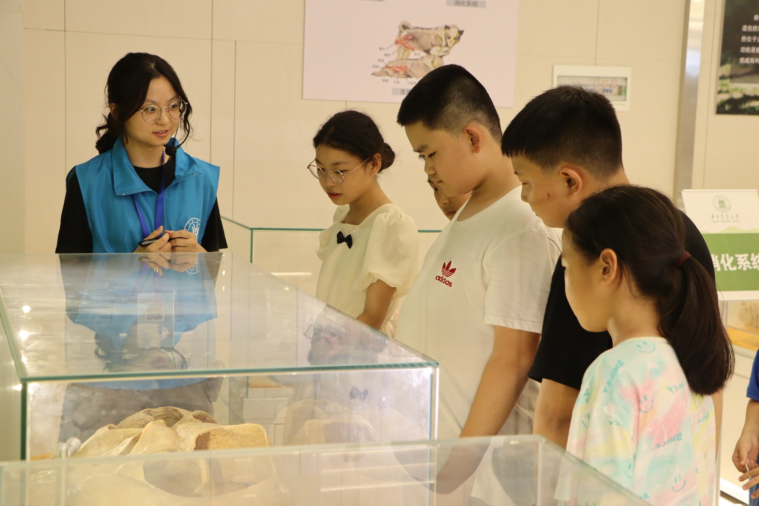 15日下午,支教队员与同学们首先来到了华农动科动医学院的标本馆。一踏入馆内,同学们便被眼前的畜牧类动物标本所吸引。讲解员仔细地为同学们讲解每种动物的身体构成,引导孩子们了解标本的制作工艺,解答他们提出的好奇问题,让他们感受到科学研究的魅力。牧医阳光支教队指导老师章佳文也来到标本馆与同学们互动交流,关心同学们的学习情况,鼓励他们珍惜这次难得的学习机会。