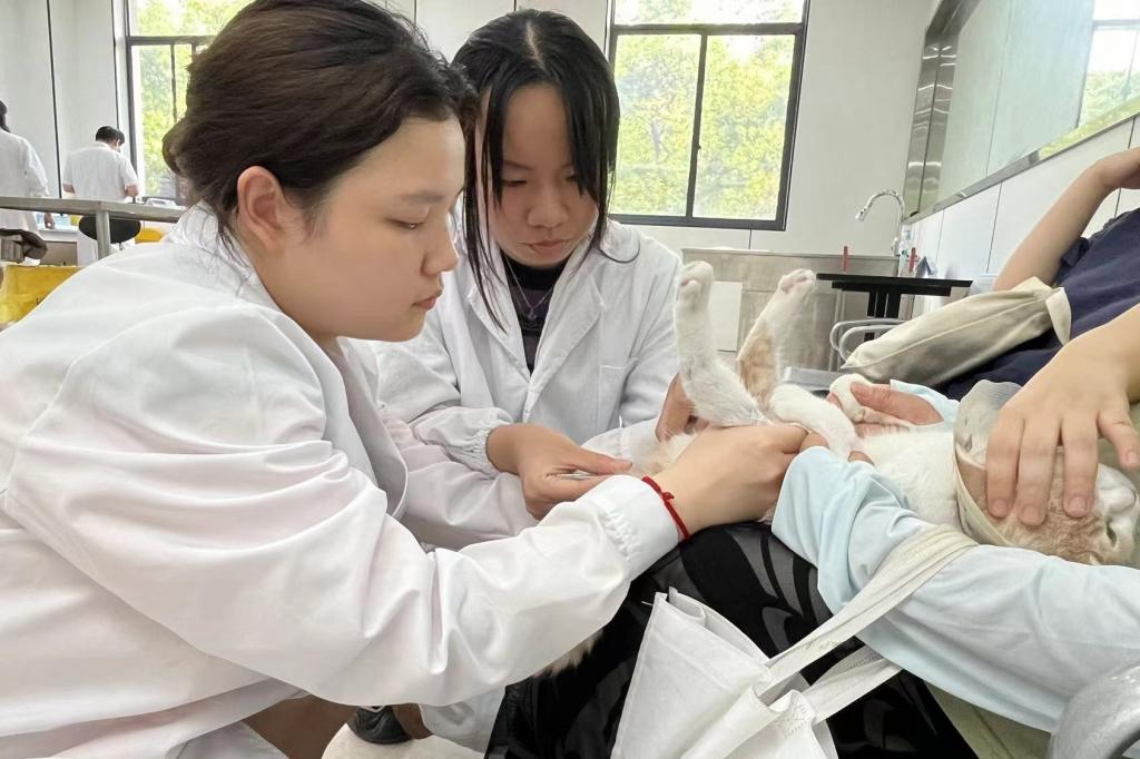 在社会实践中,团队成员们对Lucky进行了全面的健康检查,包括体温、心率、呼吸频率以及皮肤和毛发的检查。随后,他们根据“Lucky”的具体情况,结合医生所开的详细的治疗和护理计划,向Lucky的主人说明具体情况。在整个过程中,学生们展现出了高度的专业素养和责任感,他们耐心地与Lucky互动,确保它在治疗过程中感到舒适和安心。实践队队长蔡洁感慨地说:“亲眼见证诊断和治疗的每一个步骤,让我对动物医学的精细操作有了更深的理解,这种亲身体验是课堂学习无法比拟的。”