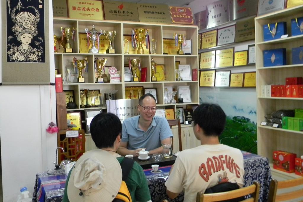 到达三江侗族自治县仙池茶业有限公司后,副总经理戴敏带领实践团队队员参观公司并同队员们进行深入交流,他从茶叶的销售、其他茶相关产品、茶文化等多个角度向实践队介绍了三江县的茶产业,并详细详述了仙池茶业在扶贫事业上的工作。