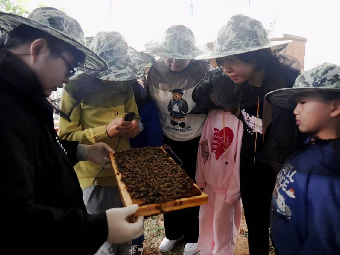 活动当天上午,志愿者带领南湖山庄社区居民们前往湖北省养蜂协会,实地深入蜂场,了解蜜蜂和蜂蜜生产过程。“工蜂、雄蜂以及蜂王在蜂群里都做着不同的工作。”工作人员的介绍让孩子们了解到蜂群的生存方式,蜜蜂通过气味、变化飞行姿态等方式进行信息传递,帮助蜂群采蜜。