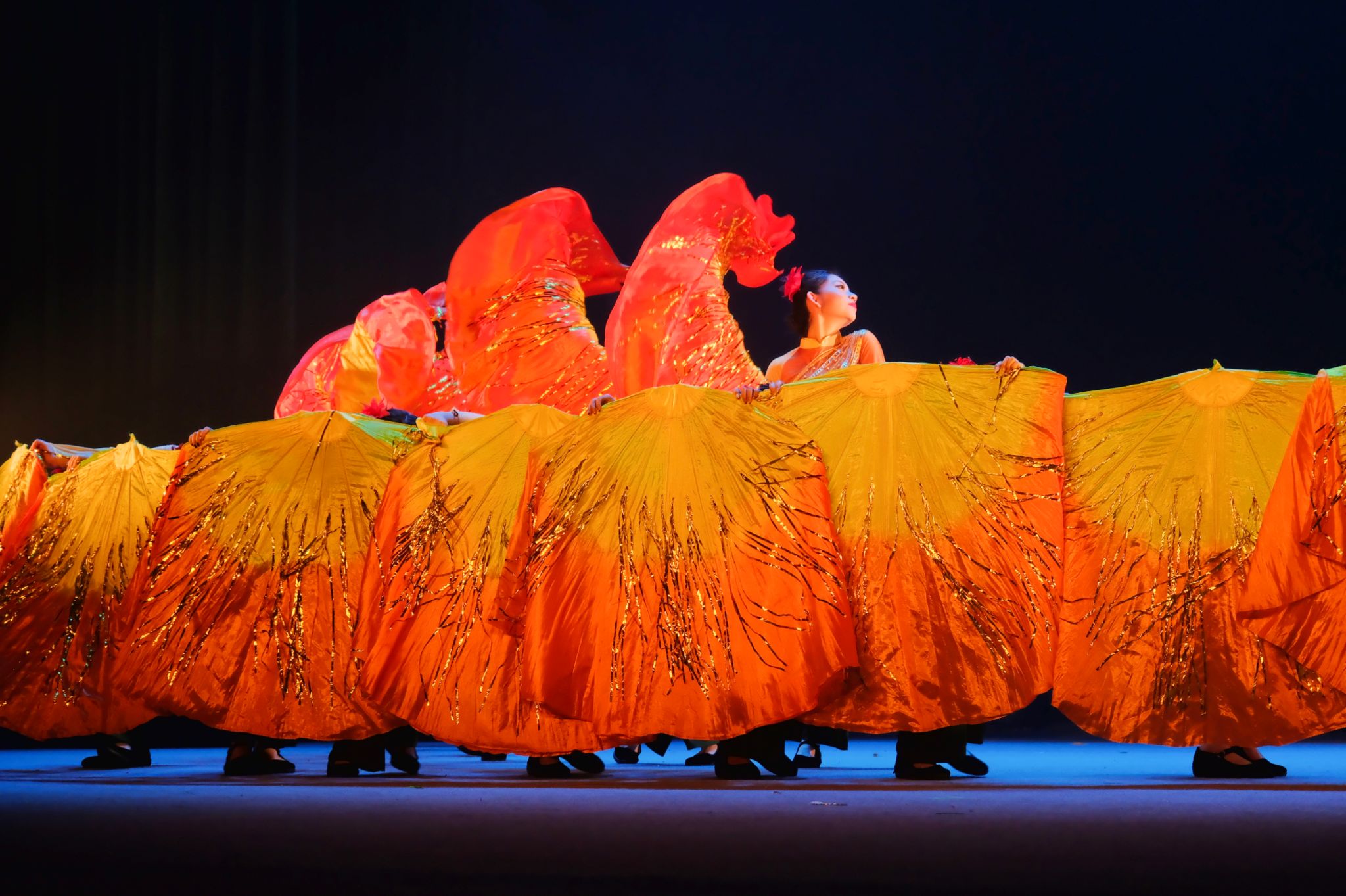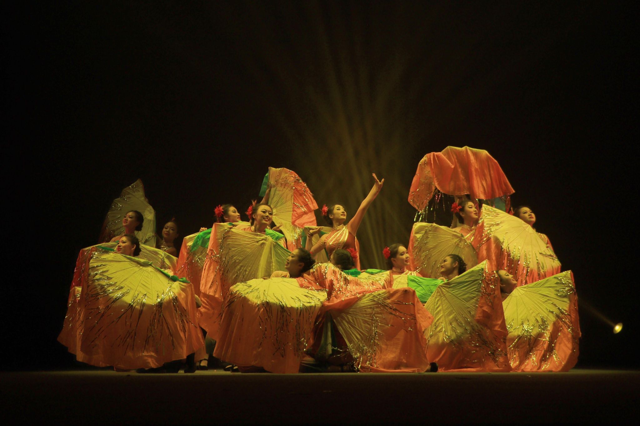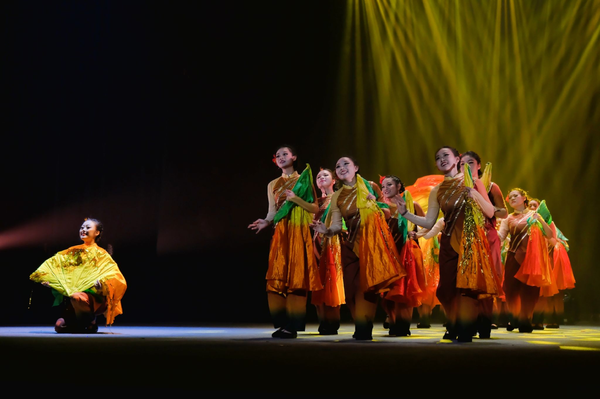 《秋熟》由动科动医舞蹈团的17名女生共同演绎,描绘出一幅秋收打麦的民间丰收图。秋风送爽,麦穗金黄,秋熟之景,尽收眼底;舞动田间,喜悦盈怀,收获之歌,响彻云霄。演员们身着金黄色的舞蹈服饰,仿佛麦浪于秋风中翩翩起舞,她们时而弯腰劳作,时而跳跃欢呼,步伐刚健,节奏鲜明,踏脚击手,情绪昂扬。舞蹈以秋收为背景,通过丰富的肢体语言结合莲湘、扇子等道具,生动展现了农民们辛勤劳作、收获果实的喜悦与满足。舞台上,灯光与音乐完美融合,氛围温馨而充满希望,观众仿佛置身于广袤麦田之中,感受大自然的壮美与和谐。
