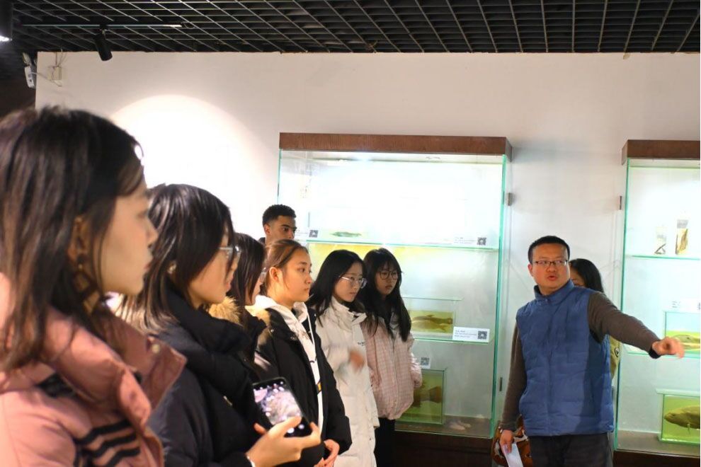 水生生物博物馆工作人员王熙引领全体成员参观了博物馆主厅,并详细介绍了馆内的主要藏品,如矛尾鱼标本、白鲟标本、白鱀豚标本、江豚标本及其骨骼等。随后,同学们参观了水产抗逆与病害防控相关实验室,以及阳台的鱼类养殖设施。在水生所科技基础能力处处长黄丹老师的带领下,师生们共同参观了中国科学院水生生物研究所所史馆,深入了解了该所的历史。