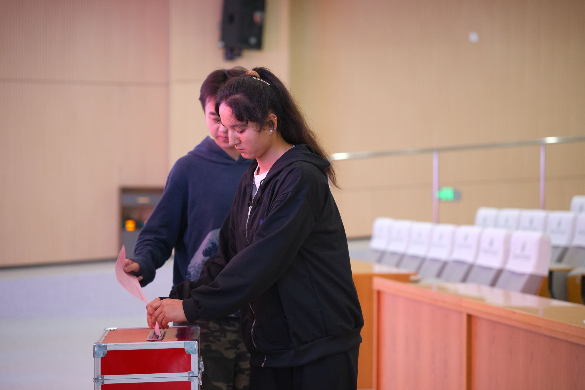随着庄严的国歌声响起,正式会议拉开序幕。在充分讨论的基础上,全体学生代表以举手表决方式全票通过了选举办法,选举总监票人、监票人、计票人建议名单以及候选人名单。按照选举办法,参会学生代表投票选出3名21级学生、8名22级学生、10名23级学生、3名24级学生,共计24名学生作为学院代表,出席太阳成集团tyc122ccvip第二十次学生代表大会。至此,会议圆满落下帷幕。