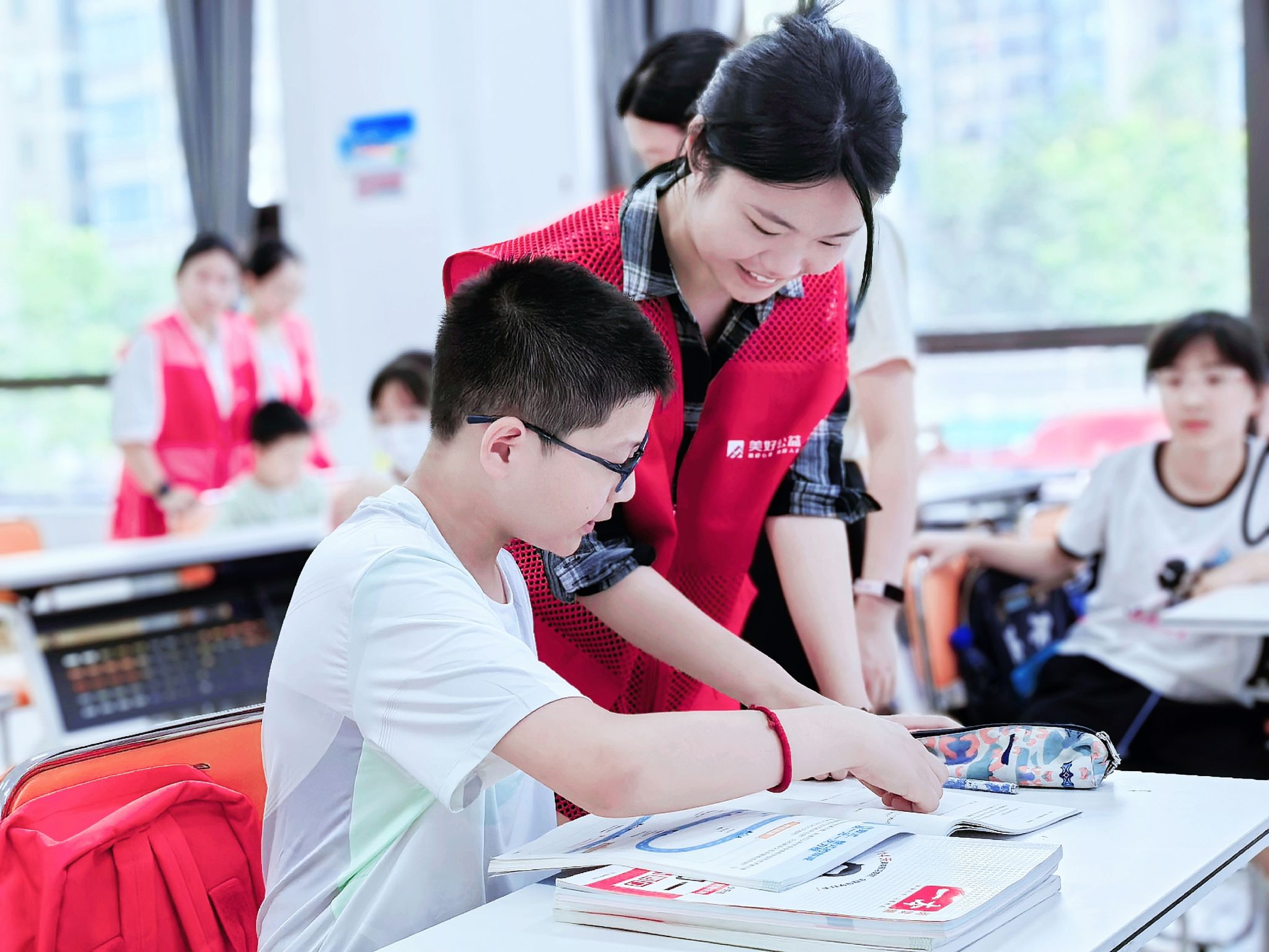 作业辅导环节采用“分层指导”模式,凸显专业团队的教学优势。针对低年级学生,实践队成员蒋情薇采用“图文结合”方式讲解生字词;面对小升初衔接阶段的孩子,实践队成员陈梦伊和彭晓愉则侧重逻辑思维培养。彭晓愉在辅导中,用动物生长周期类比代数式变量关系,将专业知识融入教学创新。