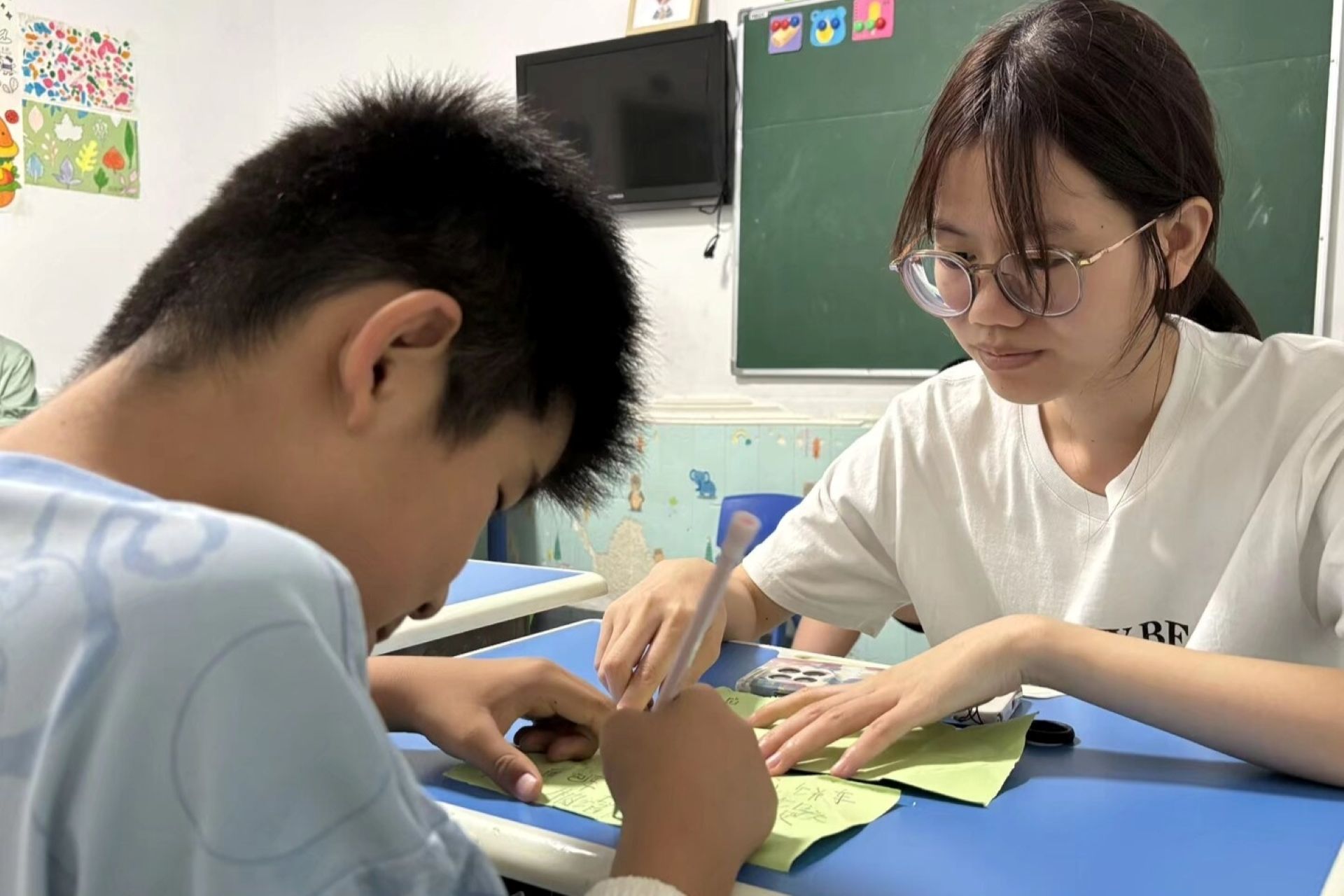继此前开展书写启蒙活动后,当日的志愿服务进一步转向基础能力培养与情感联结。在彩虹班(大班)和太阳班(中班),“大手握小手”成为最动人的场景:志愿者们俯身桌旁,耐心纠正孩子们的握笔姿势,以温暖掌心稳定他们微颤的手腕,引导笔尖在田字格上留下稚拙却坚定的印记。其中,一名自闭症儿童首次独立写出一句诗歌时,教室内自发响起轻柔掌声,孩子眼中闪烁的光芒,点亮了整个空间。