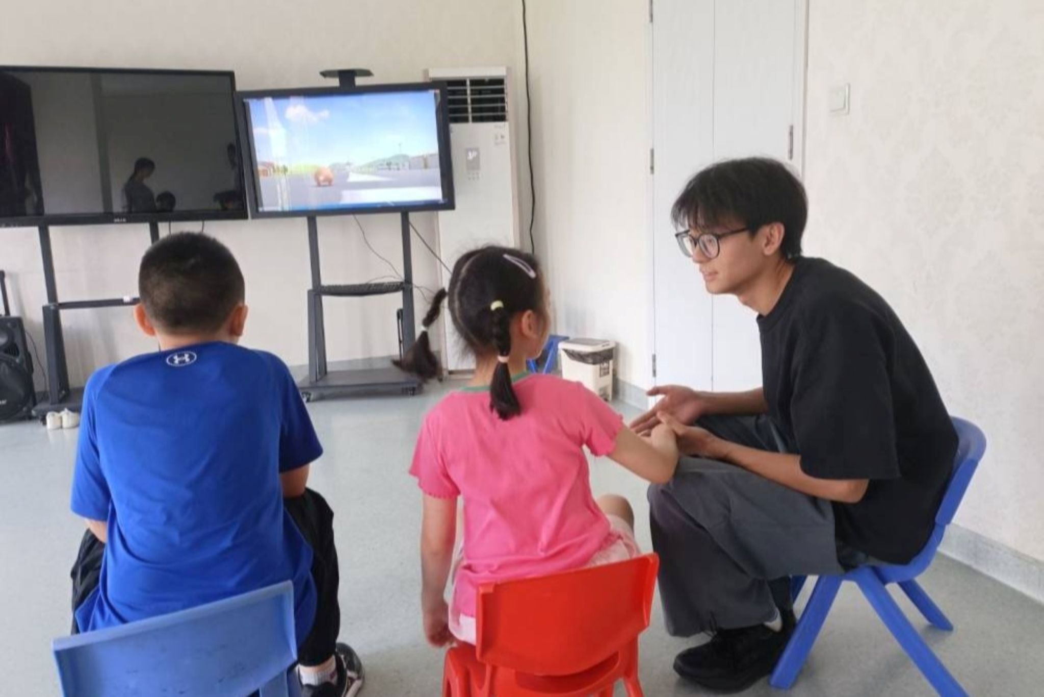 上午时分,实践团成员抵达禧乐儿童康复中心后,首先协助老师组织孩子们的早操。成员们蹲身示范动作、耐心纠正姿势,鼓励并引导孩子们跟上节奏。早操结束后,志愿者与孩子们围坐观看动画片,不时轻声交流剧情,并在观影后引导儿童描述情节,锻炼语言表达能力。 成员张正佳表示:“孩子们的笑容特别有感染力,能参与他们的日常,我们感到很有意义。”