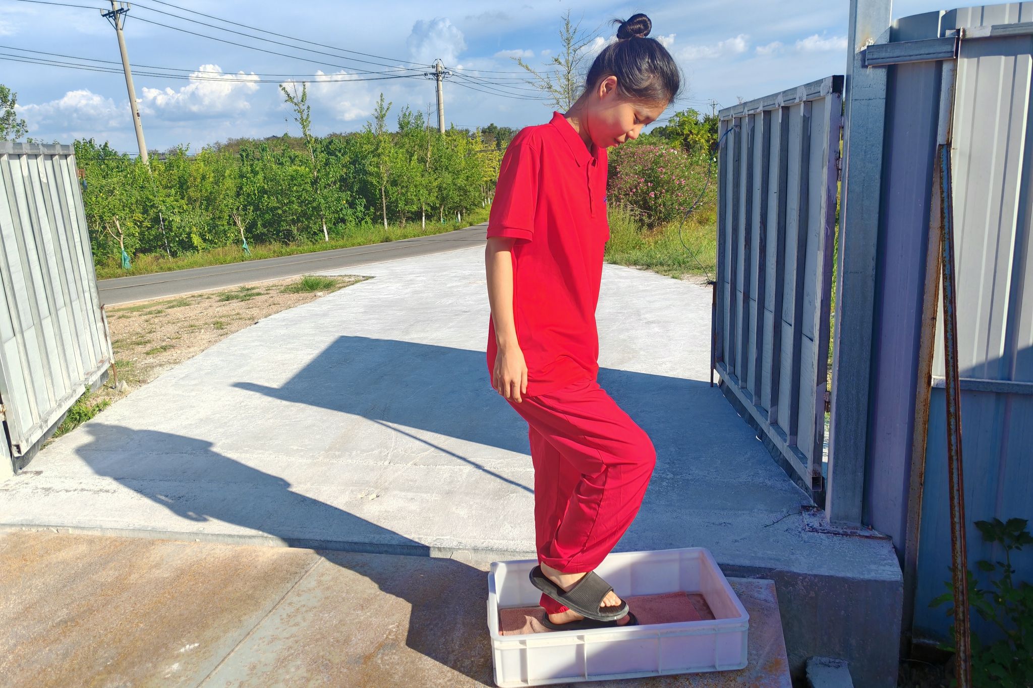 在更衣室,实践团亲历“三级防护”标准流程。李阿姨演示了标准操作:手掌浸泡入科消消毒30秒后,将随身衣物投入盛有科消的消毒池,赤脚进入淋浴间。“15分钟洗澡时间,计时器响之前不能出淋浴间。出来后要换上工作服”李阿姨向团队成员解释道。在太阳光照下,红色工作服上的“科前种业”字样格外醒目。