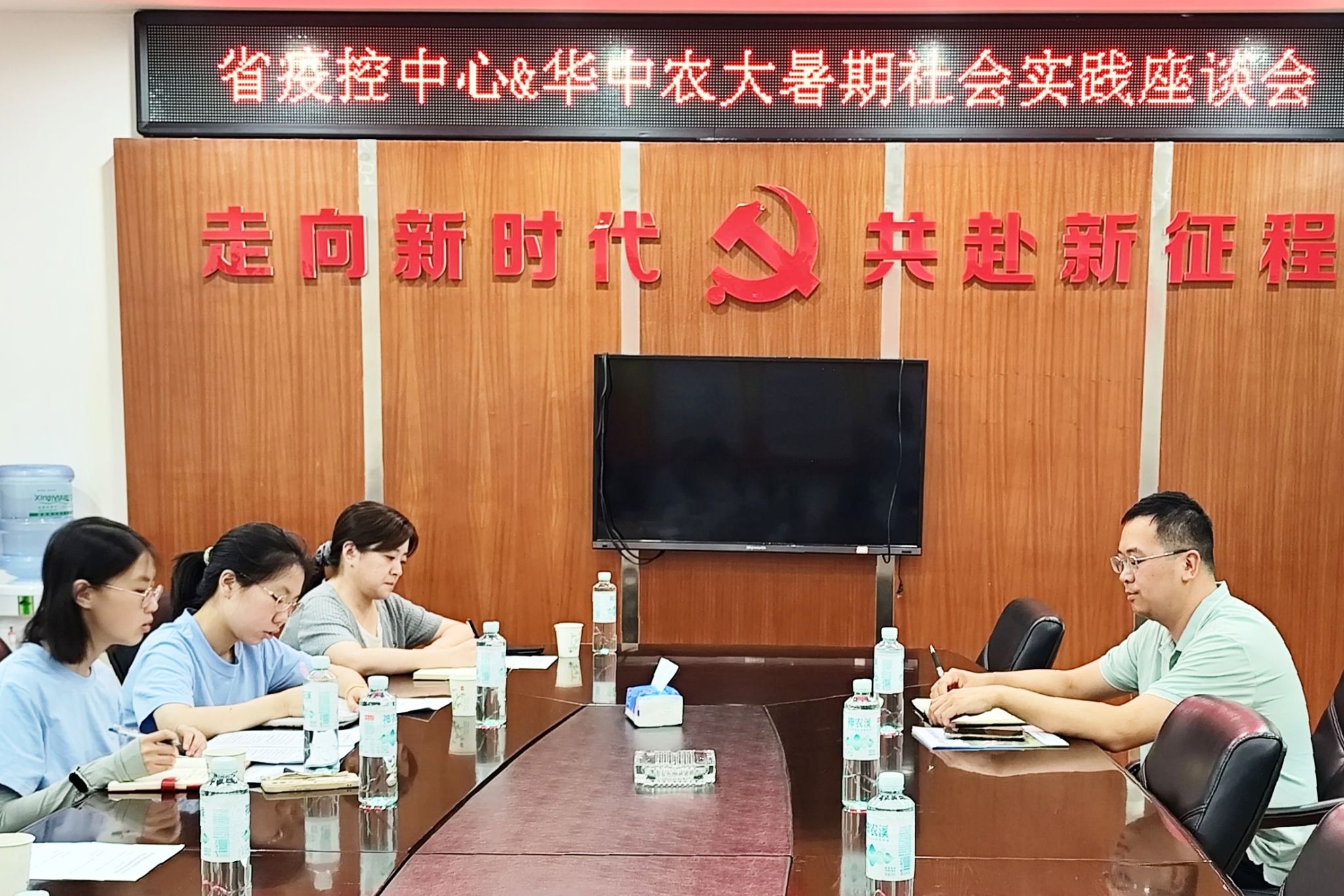 当日下午15时,实践团预研组舒艺璠、郭其琪等4名成员在指导老师黎璐带领下,与湖北省疫控中心裴洁博士、向文杰老师及宜都市畜牧兽医局杨风帆、尤太忠等负责人进行座谈。杨主任向实践团详细介绍了宜都市生猪养殖产业发展现状。裴洁博士与黎璐老师分别就“百名青年兽医进场户”行动和“乡村振兴荆楚行”青年项目进行讲述。宜都市畜牧兽医局尤太忠主任表示:“长岭岗村作为典型散养村,防疫意识普遍不足,期待专家团队为散户防控提供科学指导方案。”