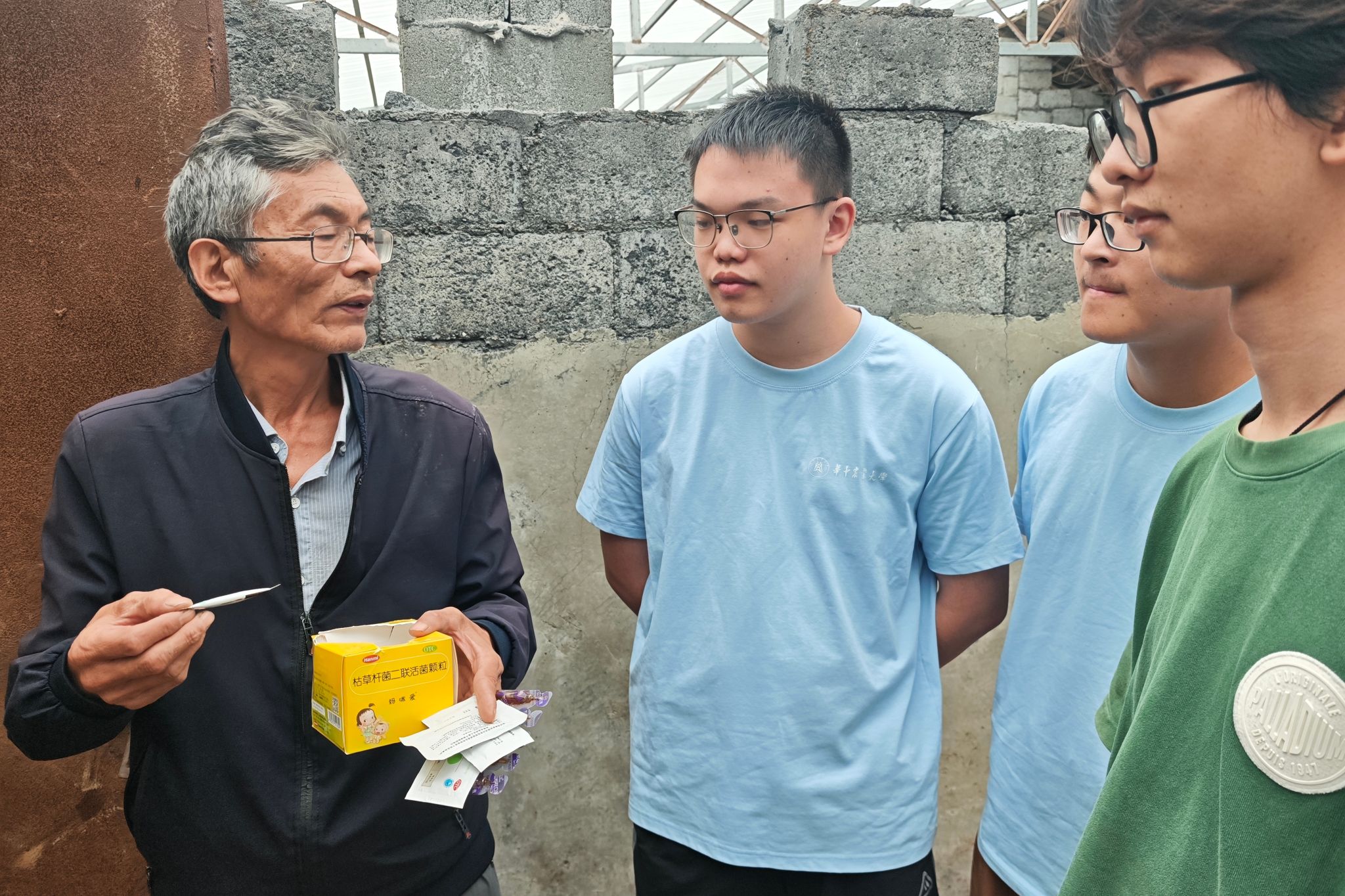 实践队抵达养殖场后,李德亮教授兼饲养员已在鹿舍旁等候。他向队员们介绍,给动物看病同样离不开“望闻问切”,并指着两只精神萎靡的鹿讲解:“你看它们脖子有些肿胀,粪便也稀,初步判断是放线菌感染。”随后,李德亮详细讲解鹿的保定技巧、麻醉剂的选择与剂量,以及针对腹泻的用药方案,从理论到实操的细致讲解展现了老兽医的专业严谨。