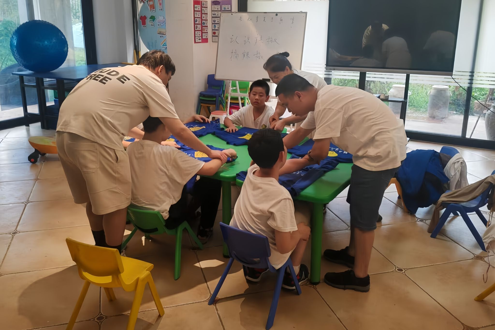 实践之初,同学们便聚焦孤独症儿童的生活能力培养。“学习晾衣服”环节中,队员化身细致导师,不仅示范衣架与衣物的精准对齐,更俯身手把手引导孩子的小手,将衣物平整挂起。即便同一个动作需重复多遍、耗时良久才能让孩子掌握,同学们始终保持耐心,孩子们也大多积极配合。他们时常毫无烦恼般笑着喊“得得(哥哥)”,纯真模样格外动人。