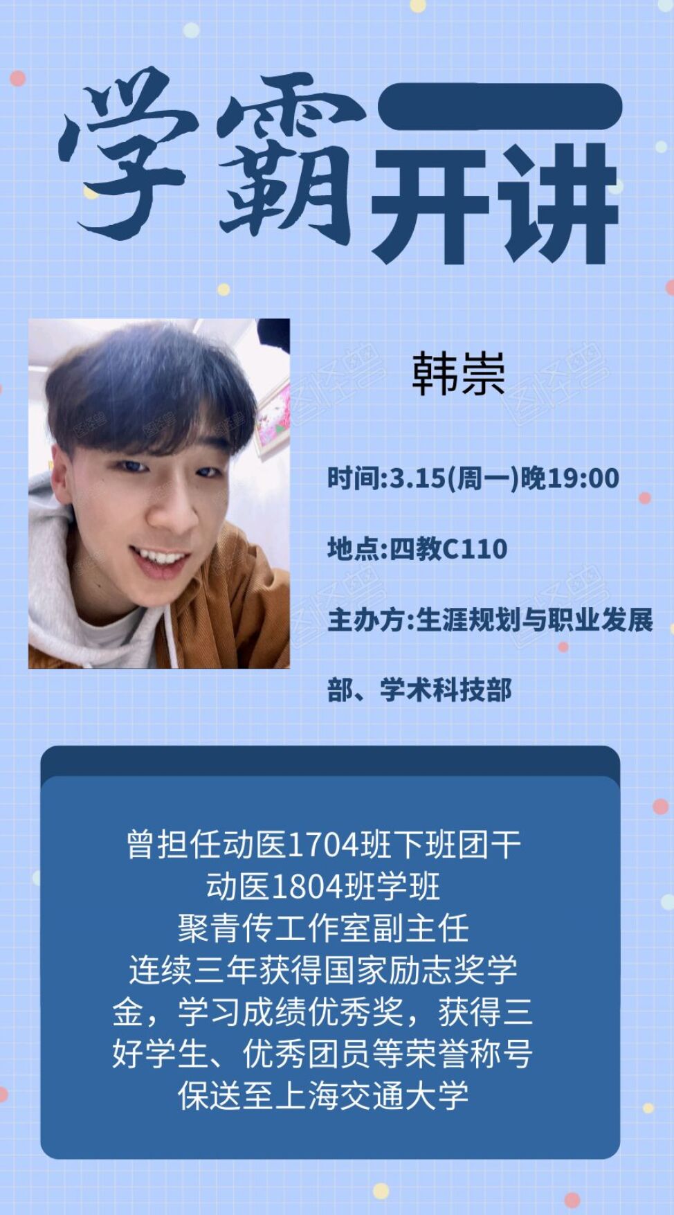 三月十五日晚七点,将在四教C110由生涯部与学科部联合举办的本学期学霸开讲活动举行,有幸邀请到了来自动科17级蔡乐学长以及动医16级雷湘学姐,韩崇学长来分享他们的学习经验。本活动旨在为低年级同学提供一些建议与指导,欢迎各位感兴趣的同学前来参与。