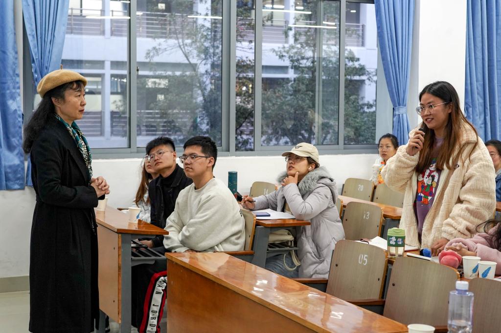 在详细讲解声母、韵母、普通话的声调的练习方法与注意事项时,她走下讲台,热情与同学们展开互动,并多次邀请同学读出发音易错词语,指出不足、耐心纠正同学们的发音。