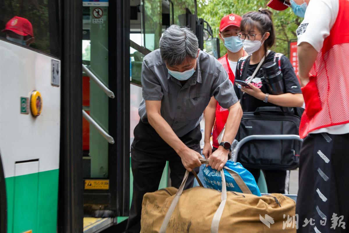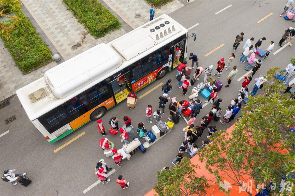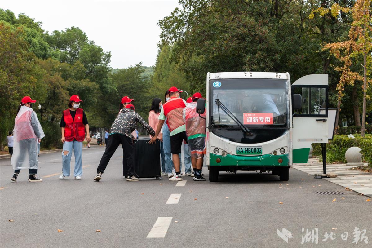 在入学通道处,设置了消毒区、查验区、核酸检测区等区域,路边停靠着一辆辆摆渡车。当新生们依次入校,穿着红马甲的志愿者们便迎上前去,帮新生们拖行李、搬上摆渡车。