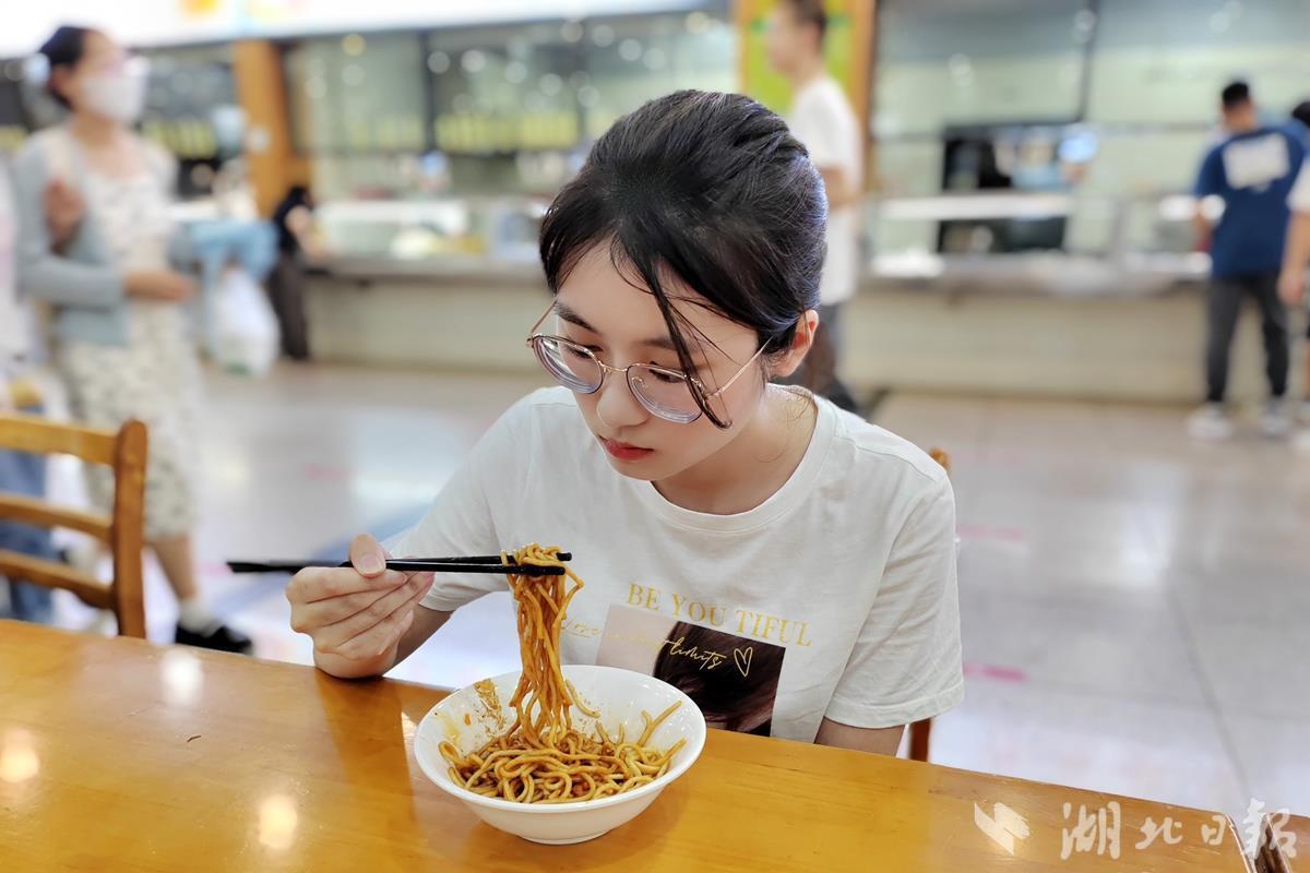 园艺专业新生应越辰是上海姑娘。来汉之前,“垂涎”热干面已久的她迫不及待地在虹桥站发了一条动态:“出发,热干面等我!”来到学校后,她走进食堂便直奔热干面窗口,在吃到香喷喷的热干面后,开心地点赞:“好吃!”