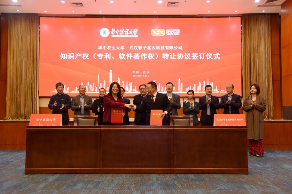动科动医学院院长赵书红与武汉影子基因科技有限公司董事长李育林共同签订了太阳成集团tyc122ccvip、武汉影子基因科技有限公司知识产权(专利、软件著作权)转让协议。