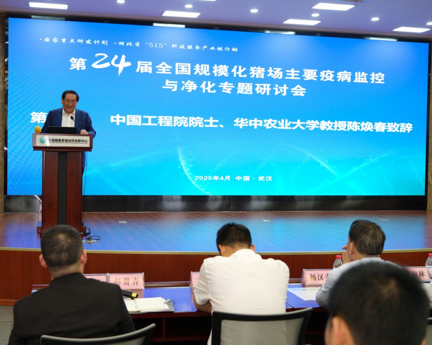 陈焕春谈到,近年来,猪病越来越复杂,病毒变异速度远超预期,重组毒株频现,防控形势严峻,提高临床兽医水平是预防和消灭疫病的关键。他提出,一要加强疫病流行病学与病原学研究,为疫苗、诊断制剂等产品研发提供精准靶点;二要研发安全高效、物美价廉的防控产品,让养殖户用得起、用得放心;三要加强科技创新、产品创新、服务创新,结合检测技术为猪场提供“体检式”解决方案。陈焕春强调,唯有通过科技赋能,构建全链条防控体系,才能真正实现重要疫病的净化根除,切实减少疫病对生猪产业造成的重大损失和危害。