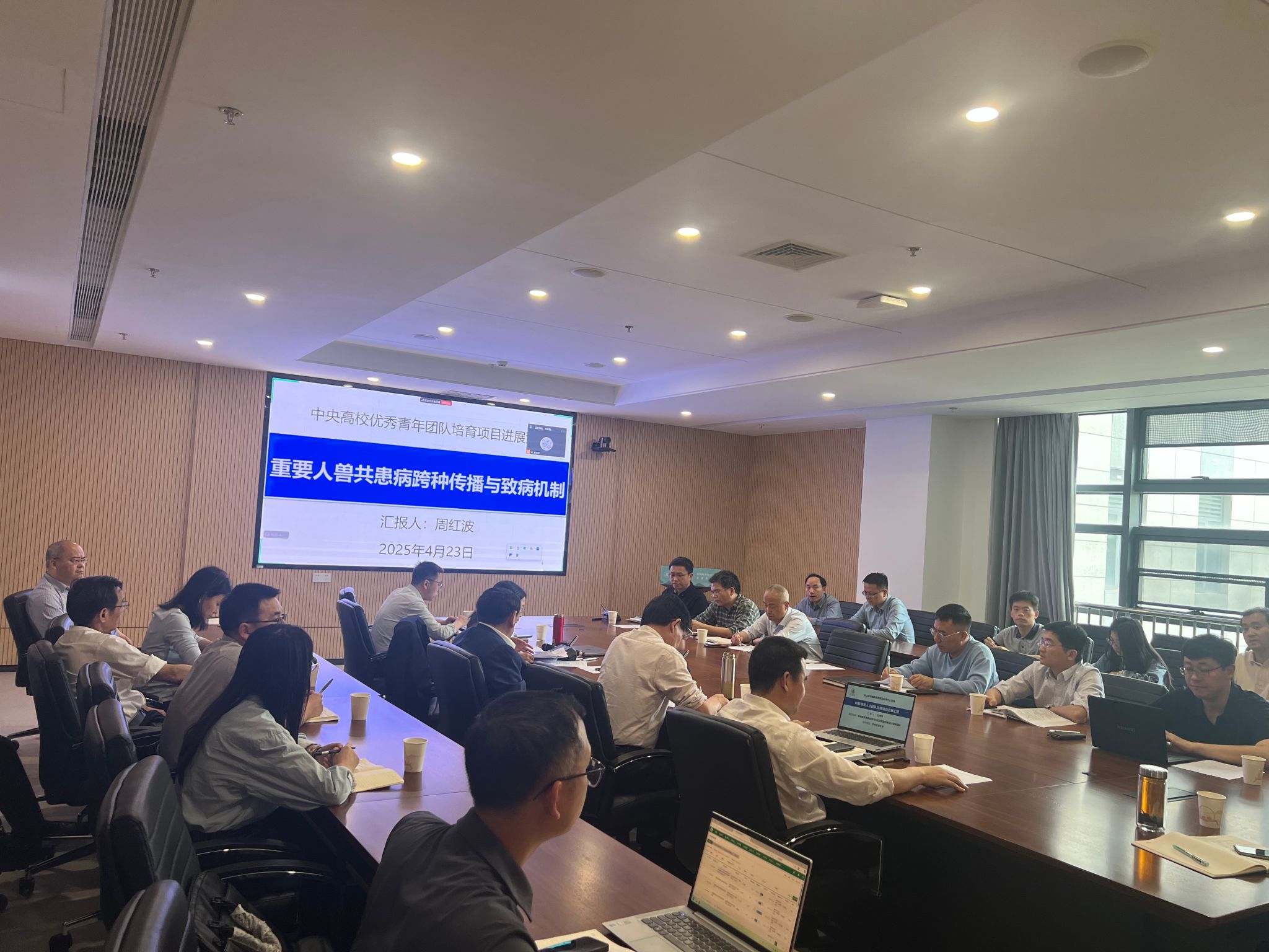 (通讯员:支彩霞 杨白玉)2025 年 4 月 23 日下午,一场聚焦动物育种与健康养殖领域前沿科研进展的会议在热烈氛围中召开。中国工程院院士陈焕春教授亲临现场,专题听取动物育种与健康养殖前沿科学中心研究进展汇报。前沿科学中心人才团队负责人彭贵青教授、周红波教授、苗义良教授、孙铝辉教授、刘小磊教授等核心成员及各团队骨干力量齐聚一堂,共话科研创新与发展。本次会议由前沿科学中心常务副主任赵书红教授主持。